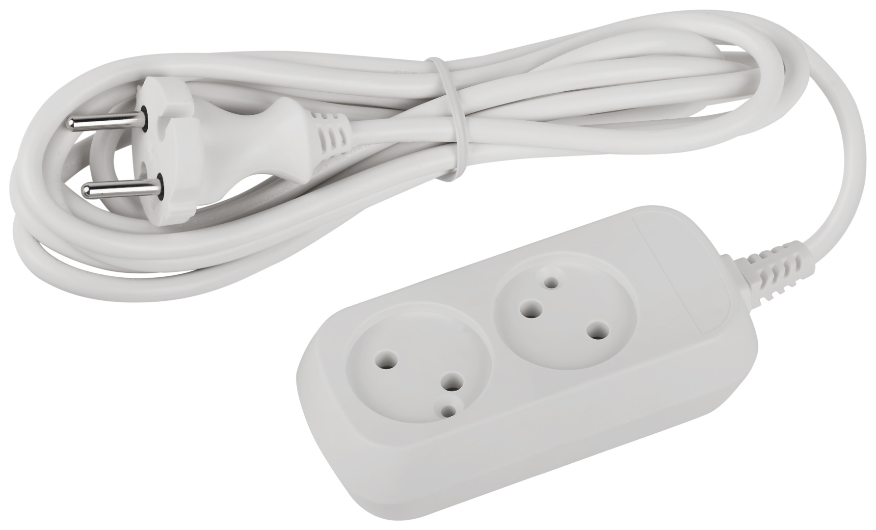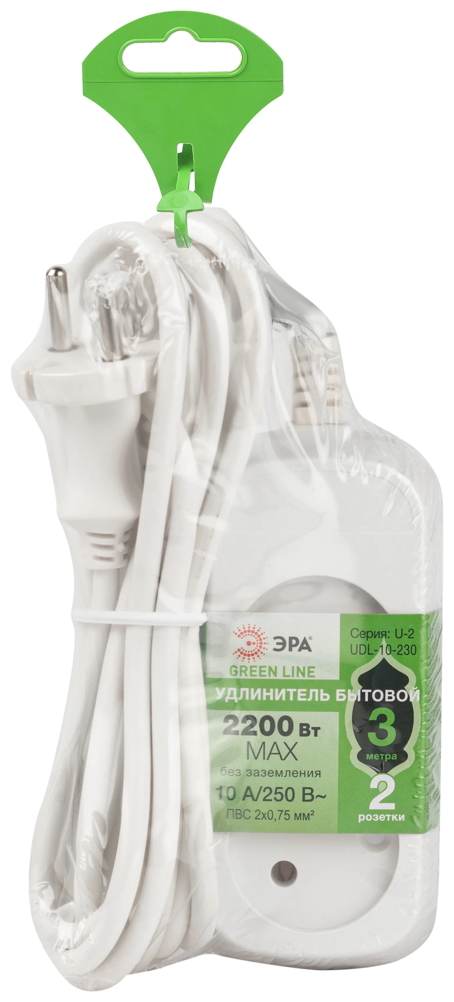 Удлинитель электрический ЭРА GREENLINE UDL-10-230 без заземления, на 2 розетки, провод 3м ПВС 2x0,75мм2. Рассчитан на максимальную мощность 10А/2200 Вт. Удлинитель станет Вашим надежным помощником, если любимые электроприборы находятся далеко от розеток. Корпус выполнен из ударопрочного и негорючего пластика (полипропилен). Модель удлинителя на 10А позволяет подключать бытовые приборы общей нагрузкой до 2200Вт.
