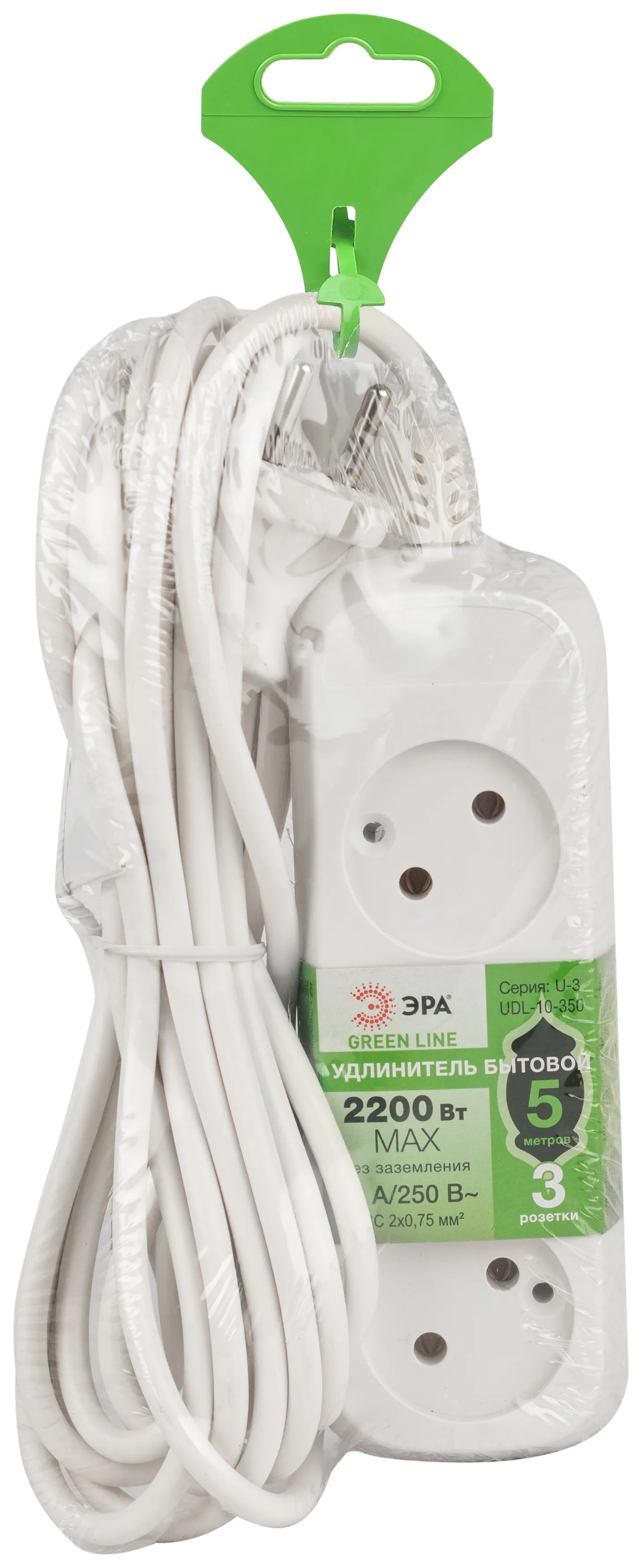 Удлинитель электрический Эра GREENLINE UDL-10-350 без заземления, на 3 розетки, провод 5м ПВС 2x0,75мм2. Рассчитан на максимальную мощность 10А/2200 Вт. Удлинитель станет Вашим надежным помощником, если любимые электроприборы находятся далеко от розеток. Корпус выполнен из ударопрочного и негорючего пластика (полипропилен). Модель удлинителя на 10А позволяет подключать бытовые приборы общей нагрузкой до 2200Вт.