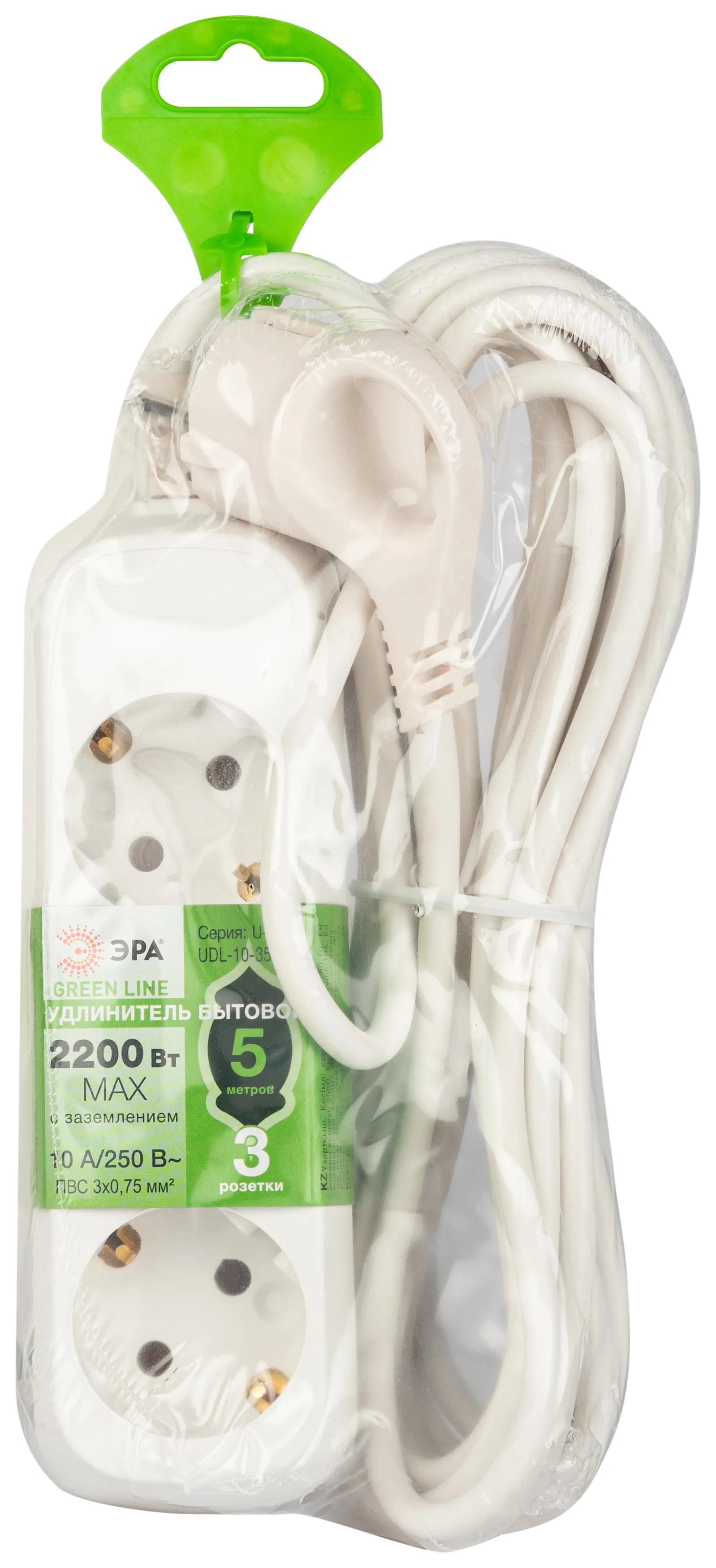 Удлинитель электрический Эра GREENLINE UDL-10-350-E с заземлением, 3 розетки, провод 5м ПВС 3x0,75мм2. Рассчитан на максимальную мощность 10А/2200 Вт. Удлинитель станет Вашим надежным помощником, если любимые электроприборы находятся далеко от розеток. Корпус выполнен из ударопрочного и негорючего пластика (полипропилен). Вилка обеспечена кольцом для удобного извлечения ее из розетки. Модель удлинителя на 10А позволяет подключить бытовые приборы общей нагрузкой до 2200Вт.