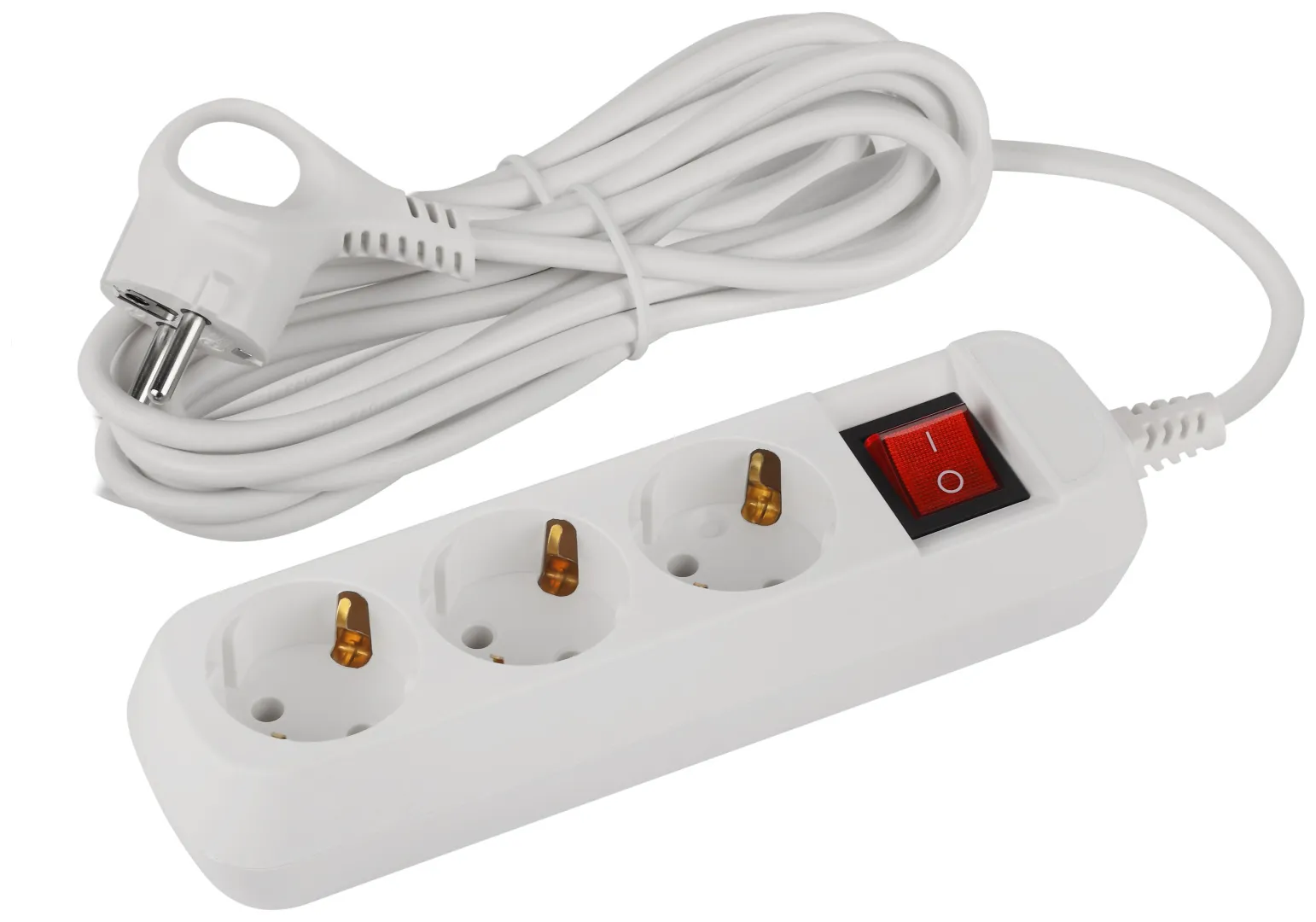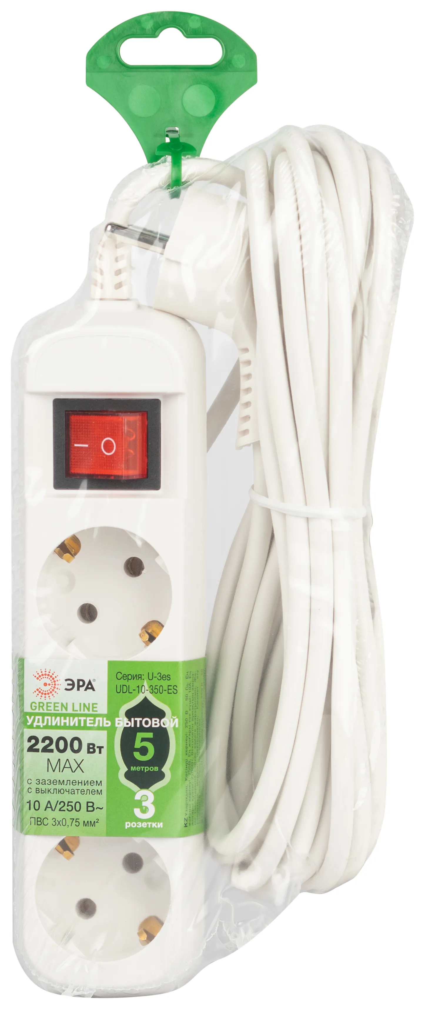 Удлинитель электрический Эра GREENLINE UDL-10-350-ES с заземлением, с выключателем, 3 розетки, провод 5м ПВС 3x0,75мм2. Рассчитан на максимальную мощность 10А/2200 Вт. Удлинитель станет Вашим надежным помощником, если любимые электроприборы находятся далеко от розеток. Корпус выполнен из ударопрочного и негорючего пластика (полипропилен). Вилка обеспечена кольцом для удобного извлечения ее из розетки. Модель удлинителя на 10А позволяет подключить бытовые приборы общей нагрузкой до 2200Вт.