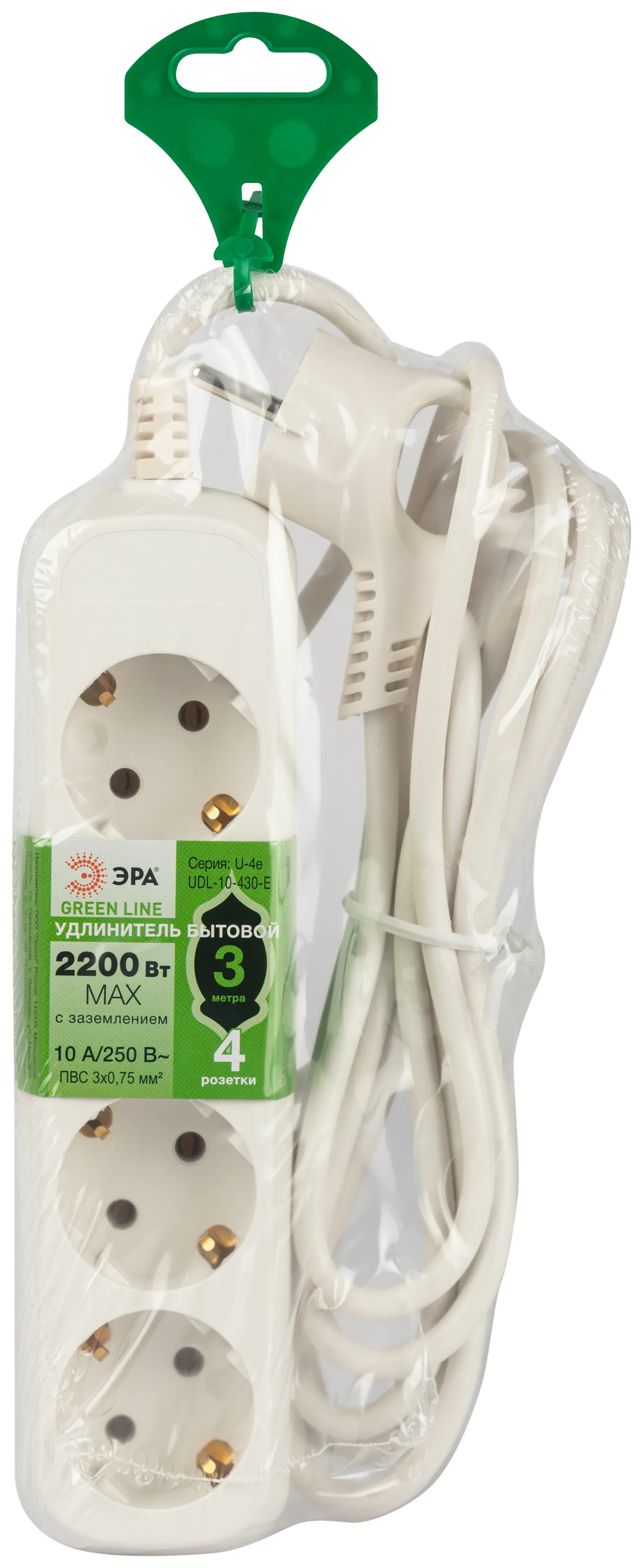Удлинитель электрический Эра GREENLINE UDL-10-430-E с заземлением, на 4 розетки, провод 3м ПВС 3x0,75мм2. Рассчитан на максимальную мощность 10А/2200 Вт. Удлинитель станет Вашим надежным помощником, если любимые электроприборы находятся далеко от розеток. Корпус выполнен из ударопрочного и негорючего пластика (полипропилен). Вилка обеспечена кольцом для удобного извлечения ее из розетки. Модель удлинителя на 10А позволяет подключить бытовые приборы общей нагрузкой до 2200Вт.