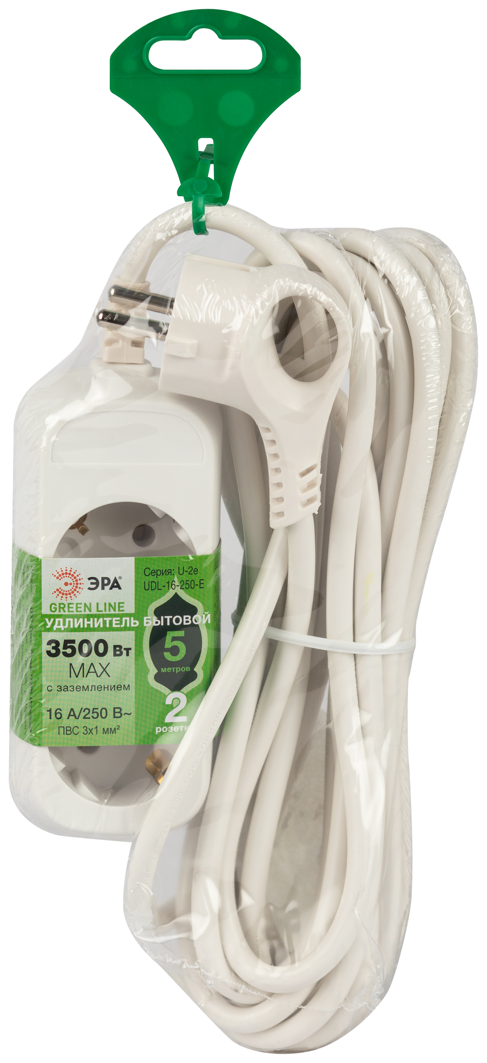 Удлинитель электрический Эра GREENLINE UDL-16-250-E с заземлением, на 2 розетки, провод 5м ПВС 3x1мм2. Рассчитан на максимальную мощность 16А/3500 Вт. Удлинитель станет Вашим надежным помощником, если любимые электроприборы находятся далеко от розеток. Корпус выполнен из ударопрочного и негорючего пластика (полипропилен). Вилка обеспечена кольцом для удобного извлечения ее из розетки. Модель удлинителя на 16А позволяет подключить бытовые приборы общей нагрузкой до 3500Вт.