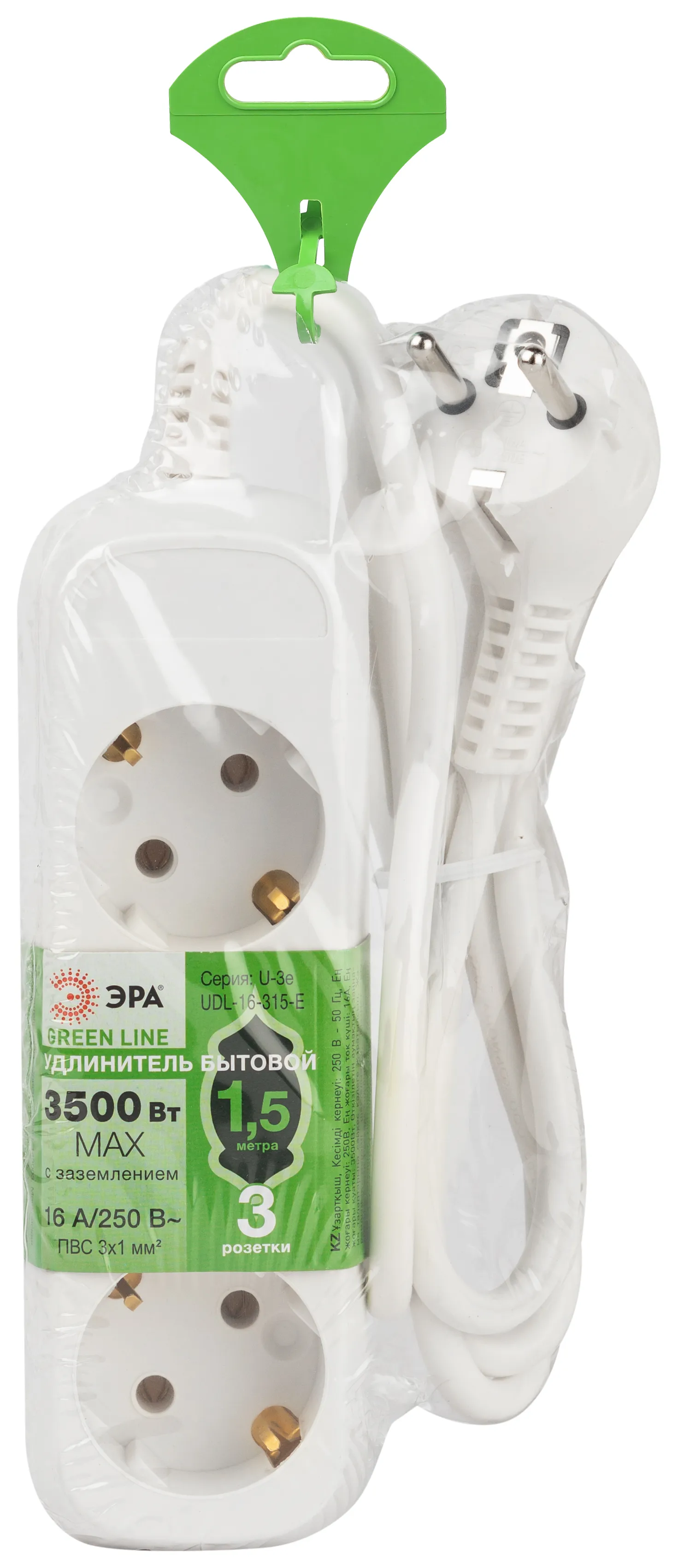 Удлинитель электрический Эра GREENLINE UDL-16-315-E с заземлением, на 3 розетки, провод 1,5м ПВС 3x1мм2. Рассчитан на максимальную мощность 16А/3500 Вт. Удлинитель станет Вашим надежным помощником, если любимые электроприборы находятся далеко от розеток. Корпус выполнен из ударопрочного и негорючего пластика (полипропилен). Вилка обеспечена кольцом для удобного извлечения ее из розетки. Модель удлинителя на 16А позволяет подключить бытовые приборы общей нагрузкой до 3500Вт.