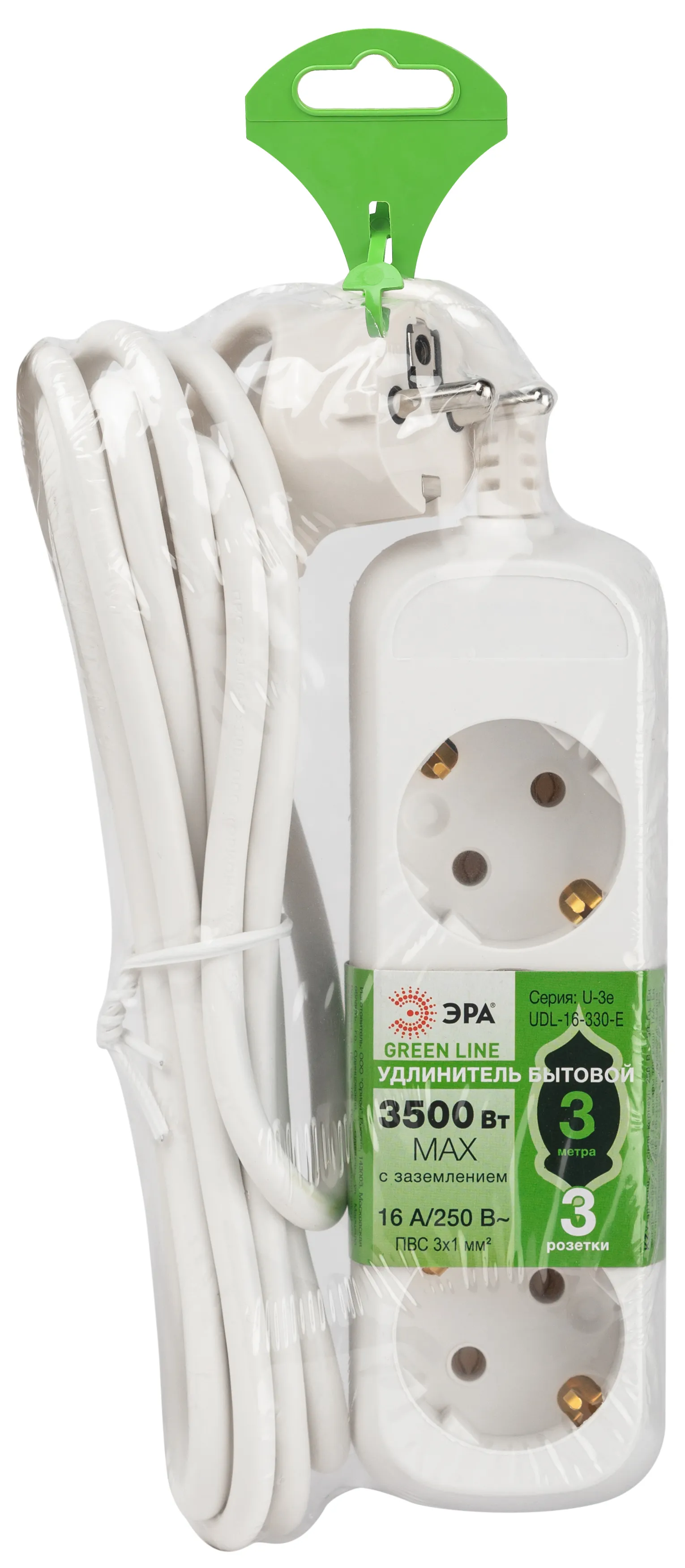 Удлинитель электрический Эра GREENLINE UDL-16-330-E с заземлением, на 3 розетки, провод 3м ПВС 3x1мм2. Рассчитан на максимальную мощность 16А/3500 Вт. Удлинитель станет Вашим надежным помощником, если любимые электроприборы находятся далеко от розеток. Корпус выполнен из ударопрочного и негорючего пластика (полипропилен). Вилка обеспечена кольцом для удобного извлечения ее из розетки. Модель удлинителя на 16А позволяет подключить бытовые приборы общей нагрузкой до 3500Вт.