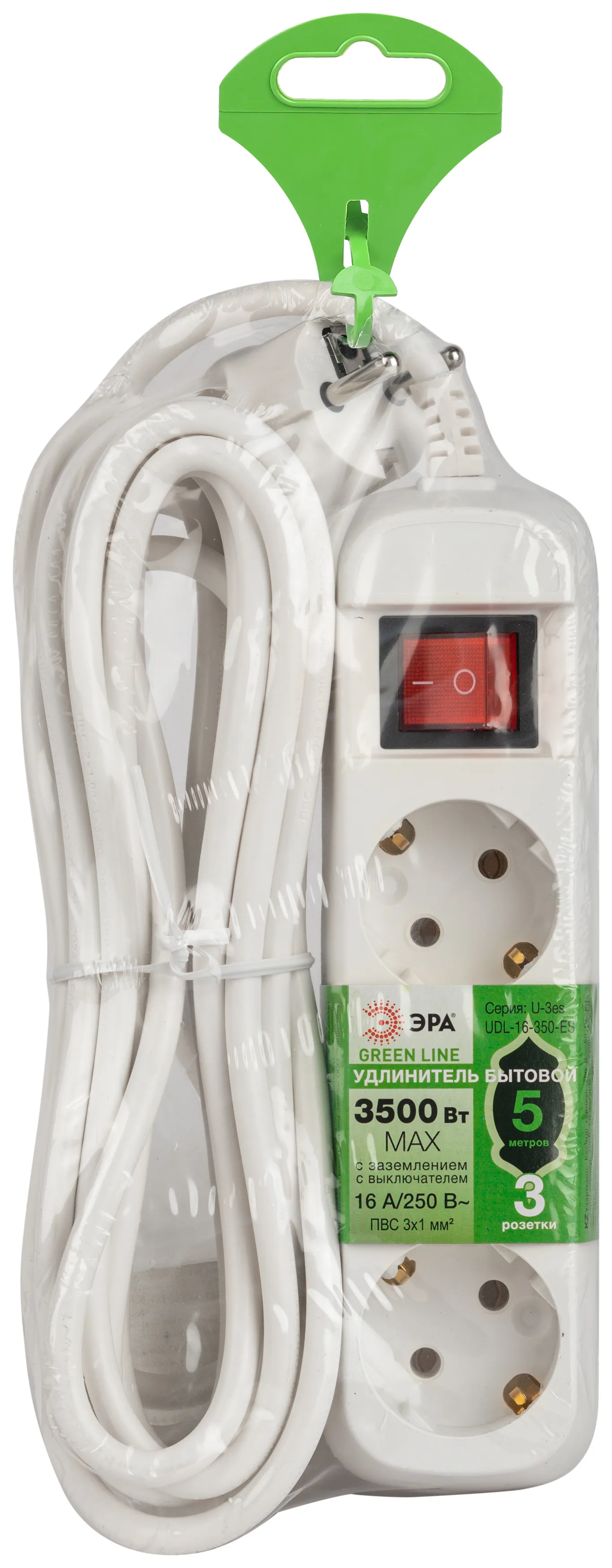 Удлинитель электрический Эра GREENLINE UDL-16-350-ES с заземлением, с выключателем, на 3 розетки, провод 5м ПВС 3x1мм2. Рассчитан на максимальную мощность 16А/3500 Вт. Удлинитель станет Вашим надежным помощником, если любимые электроприборы находятся далеко от розеток. Корпус выполнен из ударопрочного и негорючего пластика (полипропилен). Вилка обеспечена кольцом для удобного извлечения ее из розетки. Модель удлинителя на 16А позволяет подключить бытовые приборы общей нагрузкой до 3500Вт.