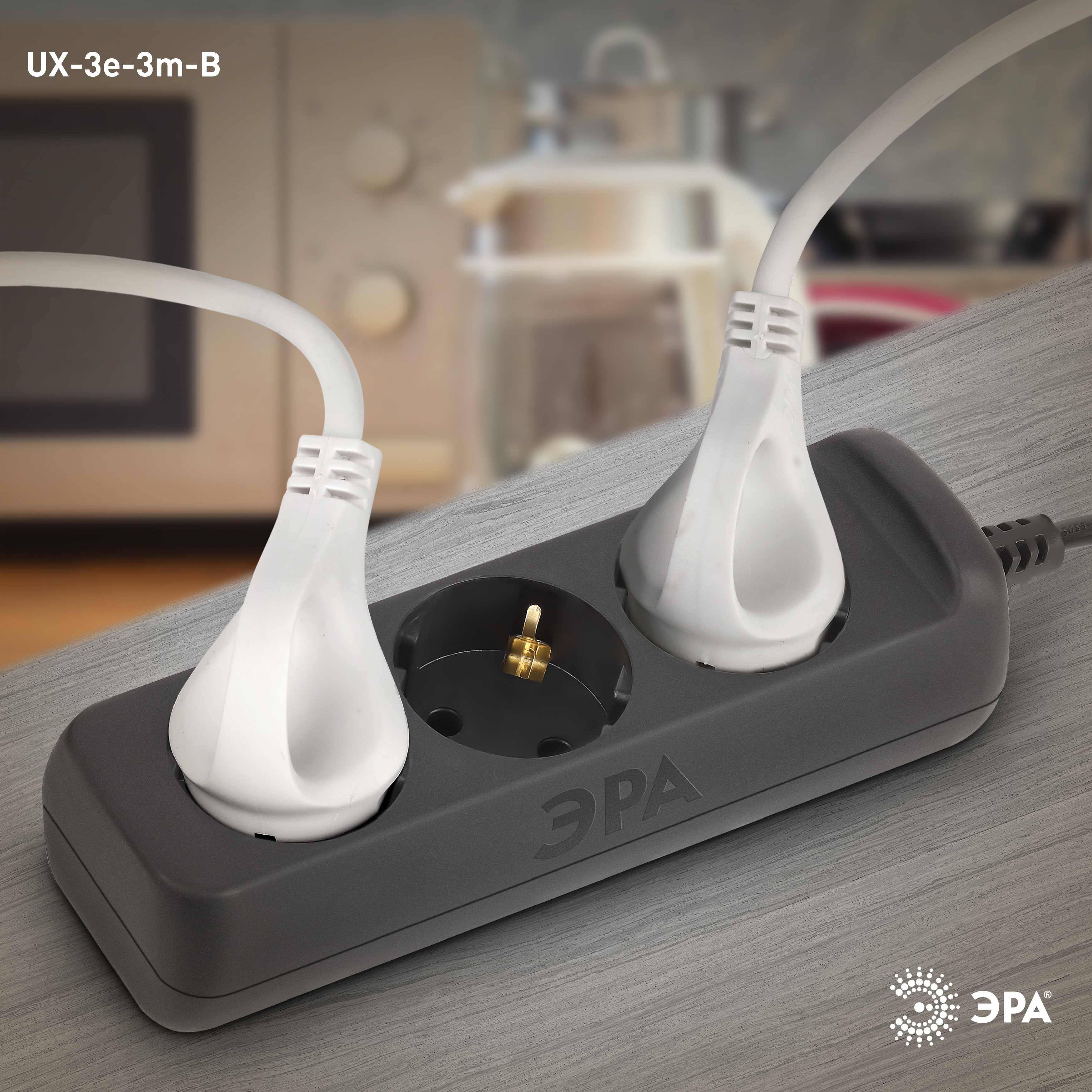 Удлинитель электрический Эра UX-3e-3m-B с заземлением, черный, 3 розетки. Провод ПВС, 3x0,75мм2, 3 м. Рассчитан на максимальную мощность 10А/2200 Вт. Удлинитель Эра станет Вашим надежным помощником, если Ваши любимые электроприборы находятся далеко от розеток. Провод в удлинителях Эра сделан из 100% меди, что делает его абсолютно пожаробезопасным. Корпус выполнен из ударопрочного и негорючего пластика (полипропилен). Вилка обеспечена кольцом для удобного извлечения ее из розетки. Модель удлинителя на 10А позволяет подключить бытовые приборы общей нагрузкой до 2200Вт. Дизайн удлинителя разработан в России командой Эра Style.