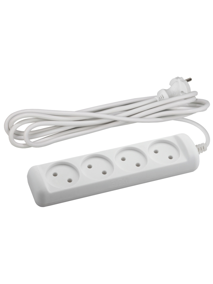 Бытовой удлинитель ЭРА UX-4-5m на 4 розетки, без заземления, с удлинённым проводом ШВВП 5 метров. Рассчитан для подключения простых бытовых приборов стандартной мощности. Максимальная нагрузка - 6 A/ 1300 Вт. Базовый белый цвет, аккуратный дизайн с закруглёнными углами. Для комфорта и безопасности гнёзда слегка "утоплены" в корпус. Изготовлен из надёжного полипропилена со специальными антипиренами, препятствующими горению.