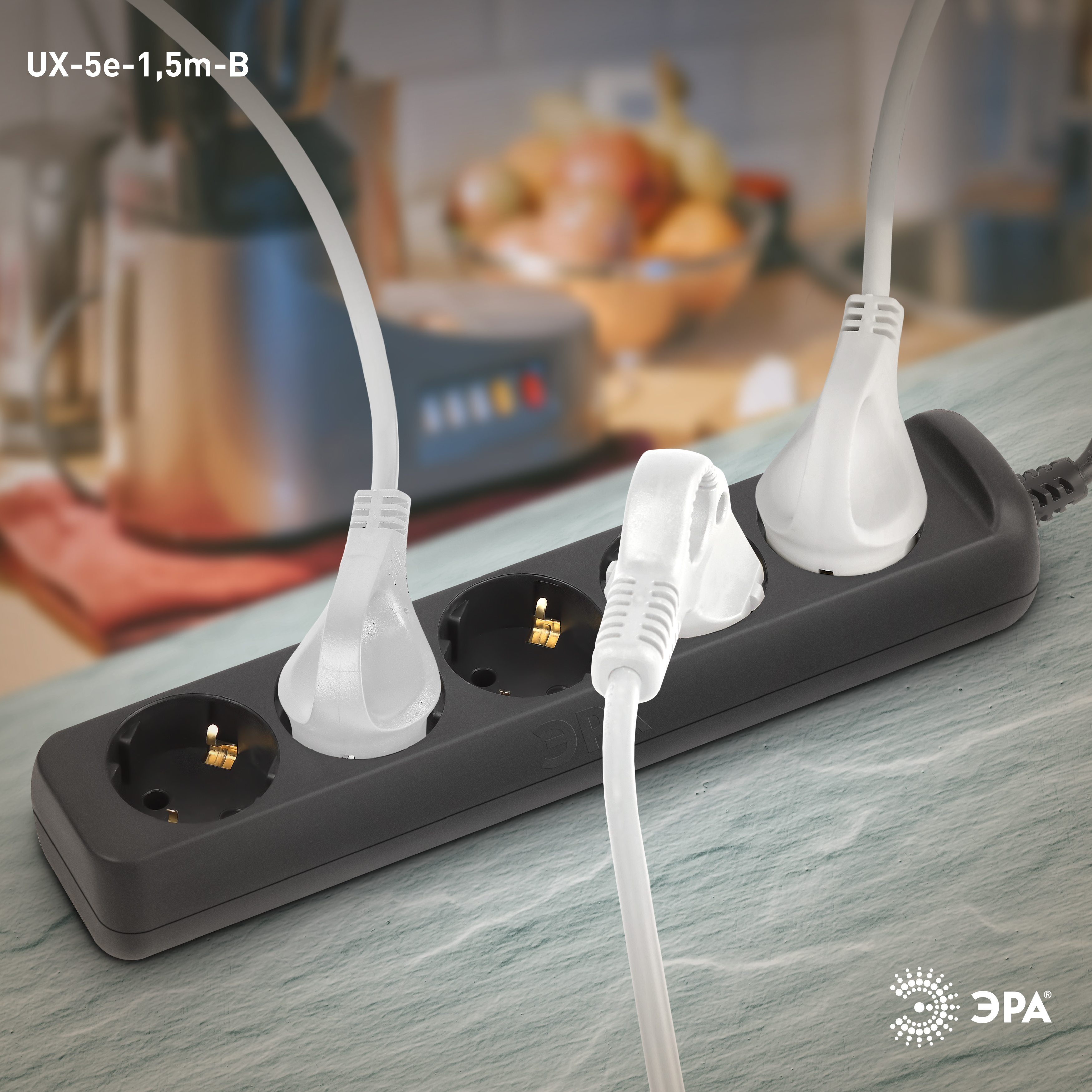 Удлинитель электрический Эра UX-5e-1,5m-B с заземлением, черный, 5 розеток. Провод ПВС, 3x0,75мм2, 1,5м. Рассчитан на максимальную мощность 10А/2200 Вт. Удлинитель Эра станет Вашим надежным помощником, если Ваши любимые электроприборы находятся далеко от розеток. Провод в удлинителях Эра сделан из 100% меди, что делает его абсолютно пожаробезопасным. Корпус выполнен из ударопрочного и негорючего пластика (полипропилен). Вилка обеспечена кольцом для удобного извлечения ее из розетки. Модель удлинителя на 10А позволяет подключить бытовые приборы общей нагрузкой до 2200Вт. Дизайн удлинителя разработан в России командой Эра Style.