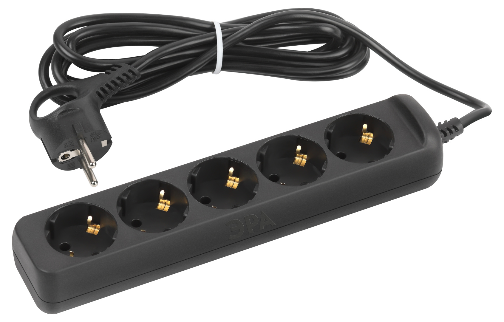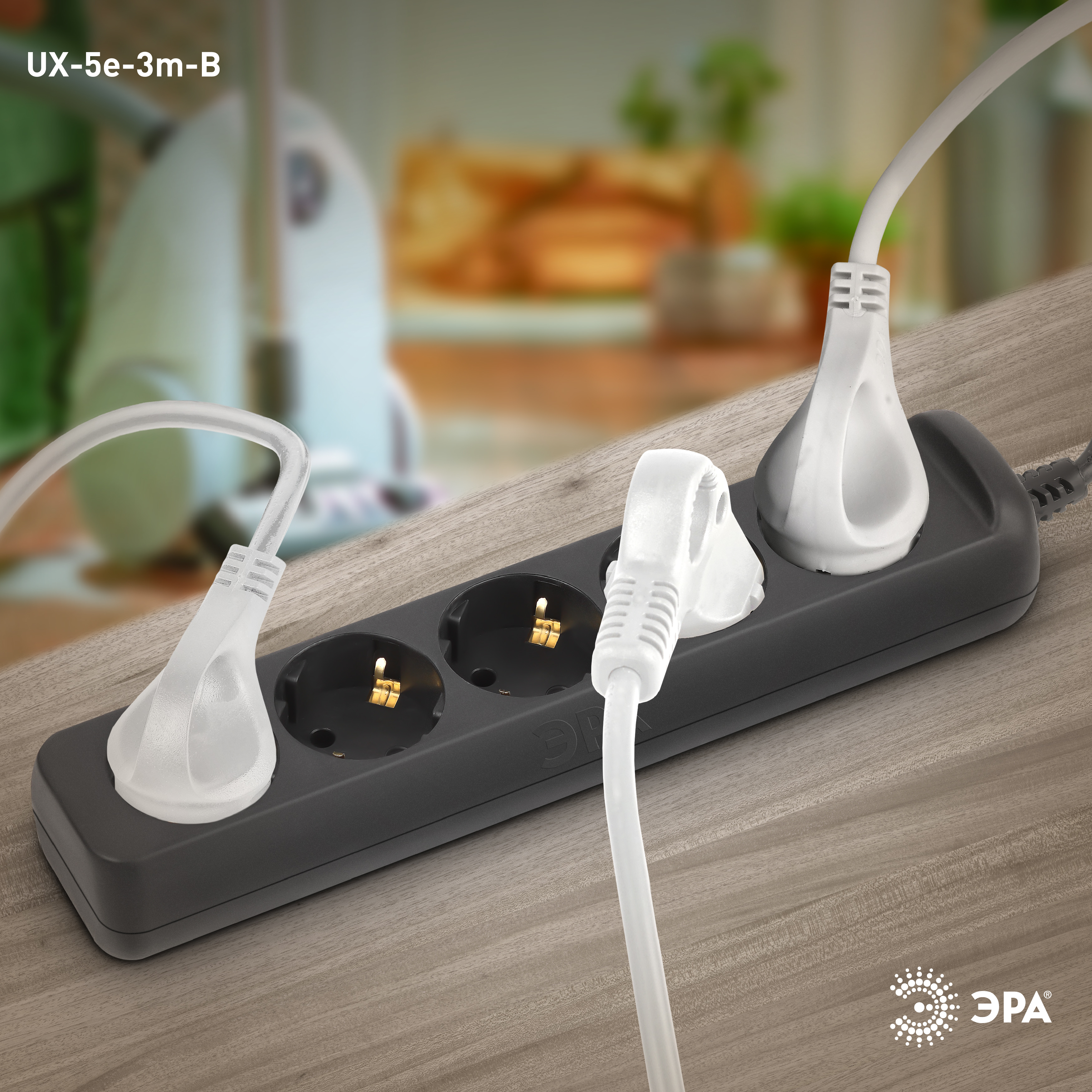 Удлинитель электрический Эра UX-5e-3m-B с заземлением, черный, 5 розеток. Провод ПВС, 3x0,75мм2, 3 м. Рассчитан на максимальную мощность 10А/2200 Вт. Удлинитель Эра станет Вашим надежным помощником, если Ваши любимые электроприборы находятся далеко от розеток. Провод в удлинителях Эра сделан из 100% меди, что делает его абсолютно пожаробезопасным. Корпус выполнен из ударопрочного и негорючего пластика (полипропилен). Вилка обеспечена кольцом для удобного извлечения ее из розетки. Модель удлинителя на 10А позволяет подключить бытовые приборы общей нагрузкой до 2200Вт. Дизайн удлинителя разработан в России командой Эра Style.