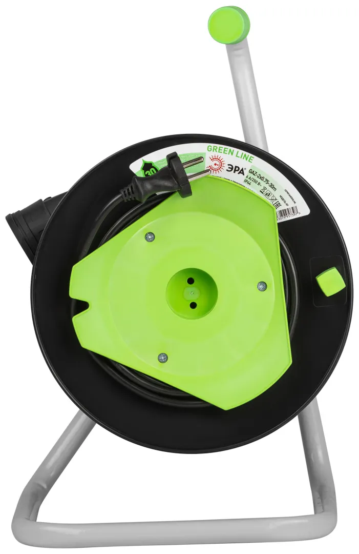Удлинитель силовой ЭРА GREEN LINE на пластиковой катушке GAZ-2x0.75-30m, 1 розетка без крышки-IP20 без заземления. Провод 30м ПВС 2х0,75мм2. Мощность 6А/1300Вт. Используется для работы на строительных площадках или дачных участках. Удобен при работе с приборами, находящимися удаленно от стационарной розетки. Например, газонокосилки, электрические, пилы, триммеры или электродрели. Рама удлинителя сделана из высокопрочной стали, а пластиковой корпус катушки выполнен с применением негорючих добавок.