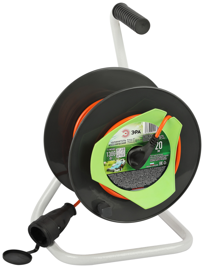 Удлинитель силовой на пластиковой катушке ЭРА RP-1e-3х0.75-20m с заземлением, 1 розетка, провод ПВС 3х0,75м2, 20 м. Мощность 6А/1300Вт. Степень защиты IP44. Используется для работы на строительных площадках или дачных участках. Удобен при работе с приборами, находящимися удаленно от стационарной розетки. Например, газонокосилки, электрические, пилы, триммеры или электродрели. Провод в удлинителях Эра сделан из 100% меди, что делает его абсолютно пожаробезопасным. Рама удлинителя сделана из высокопрочной стали, а пластиковой корпус выполнен с применением негорючих добавок.