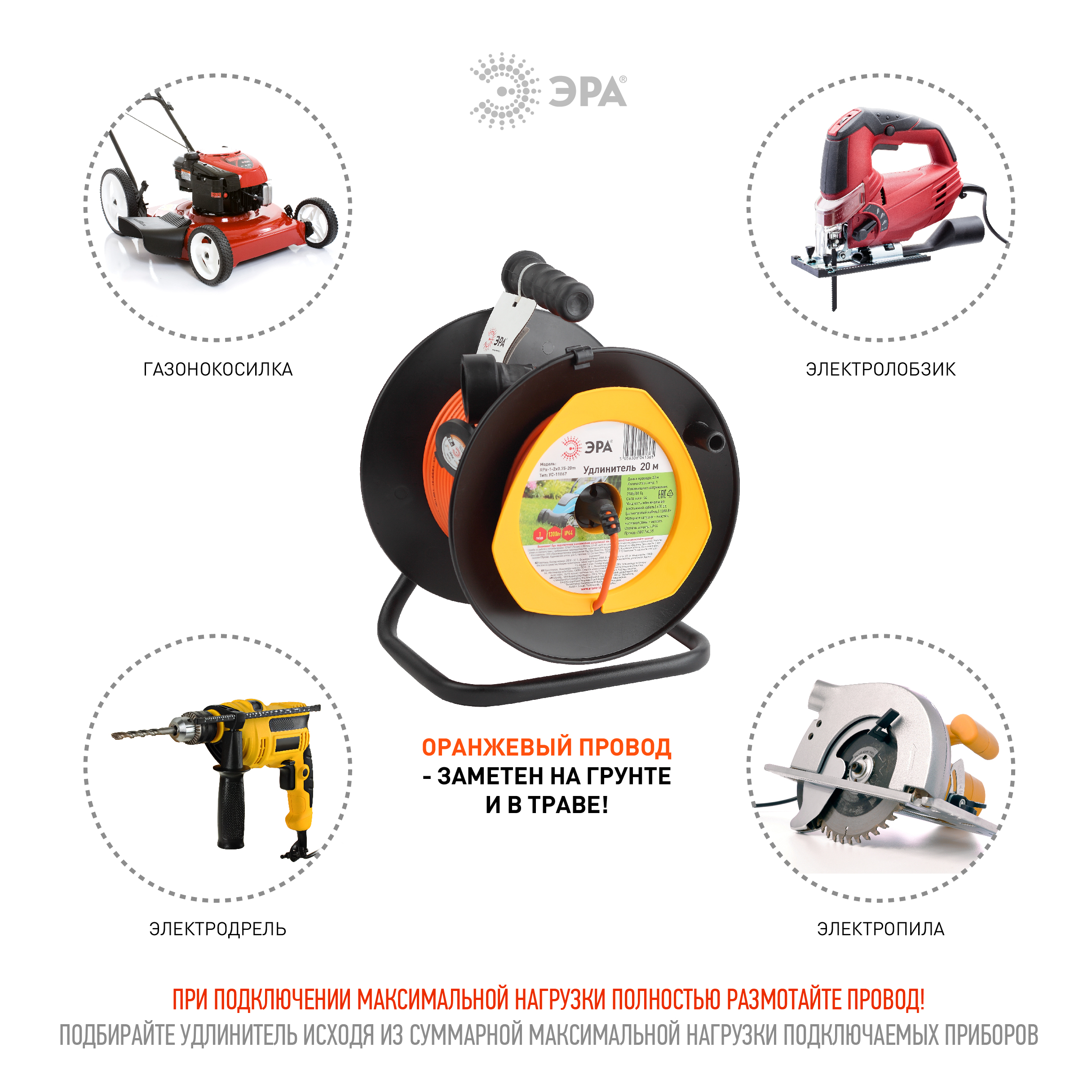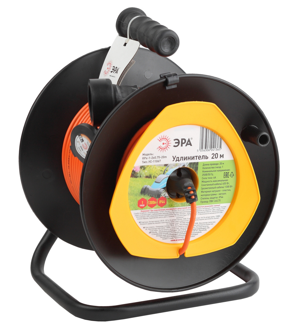Удлинитель силовой на пластиковой катушке ЭРА RPx-1-2x0.75-20m без заземления, ПВС 2х0,75м2, 1 розетка, 20 м. Мощность 6А/1300Вт. Используется для работы на строительных площадках или дачных участках. Удобен при работе с приборами находящимися удаленно от стационарной розетки. Например, газонокосилки, электрические, пилы, триммеры или электродрели. Провод в удлинителях Эра сделан из 100% меди, что делает его абсолютно пожаробезопасным. Рама удлинителя сделана из высокопрочной стали а пластиковой корпус выполнен с применением негорючих добавок.
