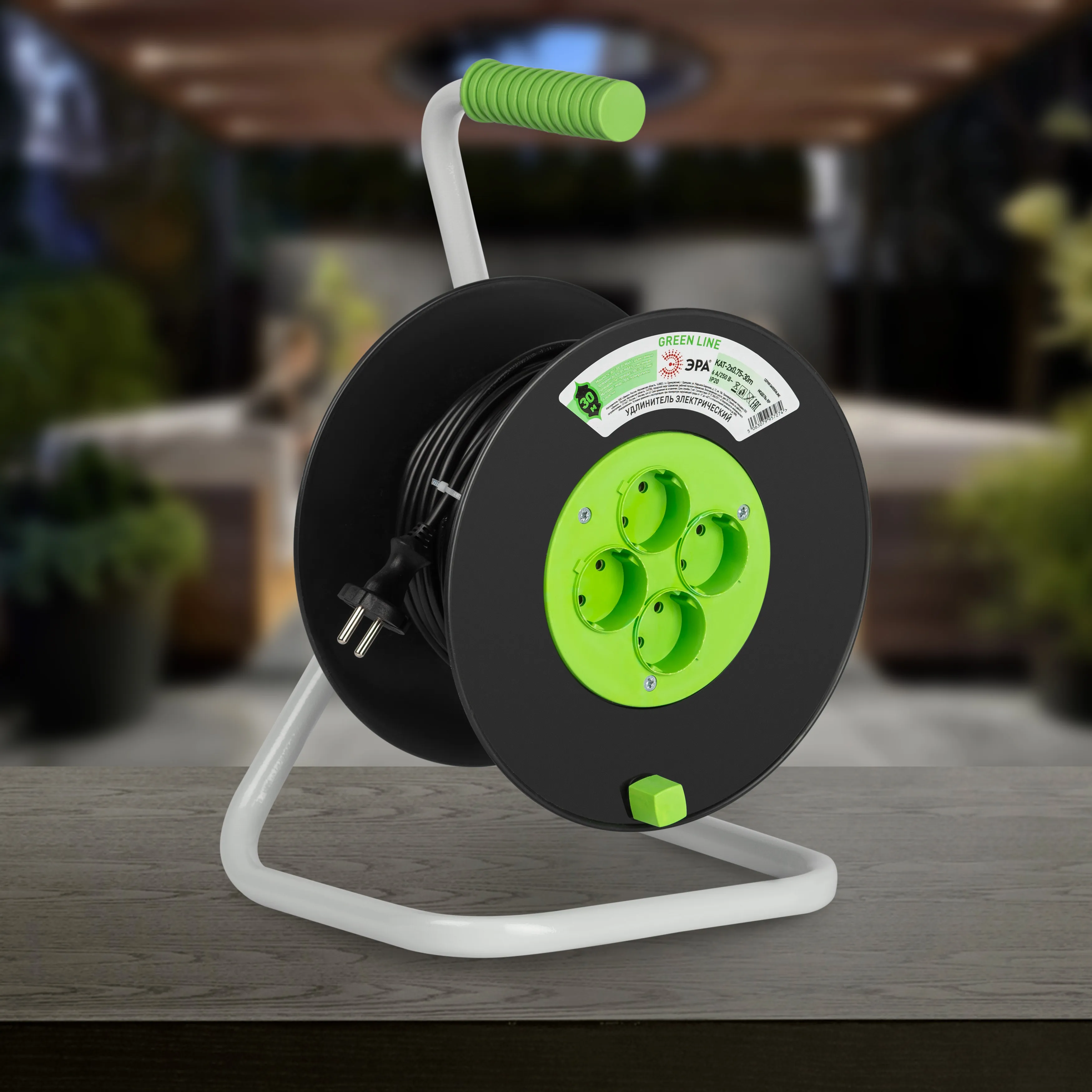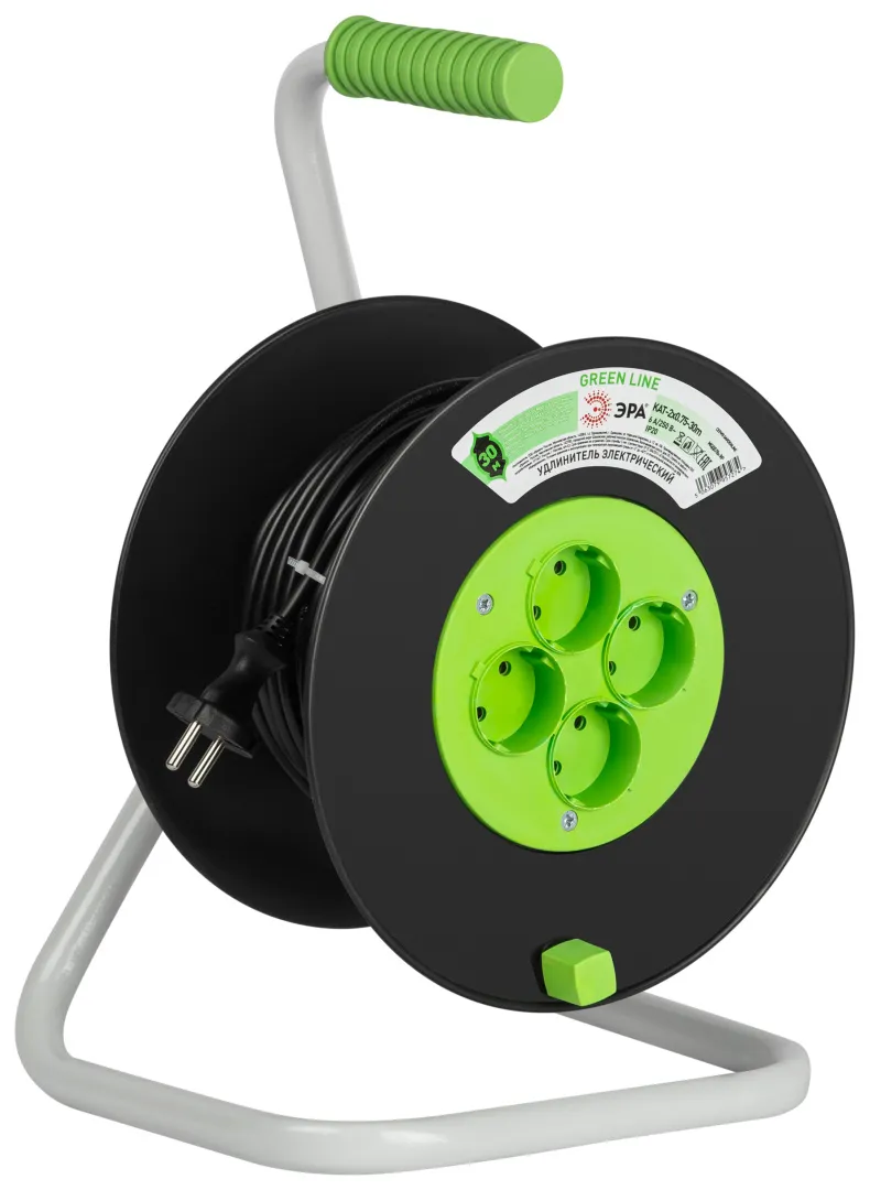 Удлинитель силовой ЭРА GREEN LINE на пластиковой катушке KAT-2x0.75-30m, 4 розетки без крышек - IP 20 без заземления. Провод ПВС 2х0,75мм2, 30м. Мощность 6А/1300Вт. Используется для работы на строительных площадках или дачных участках. Удобен при работе с приборами, находящимися удаленно от стационарной розетки. Например, газонокосилки, электрические, пилы, триммеры или электродрели. Рама катушки сделана из высокопрочной стали, а пластиковой корпус катушки выполнен с применением негорючих добавок.