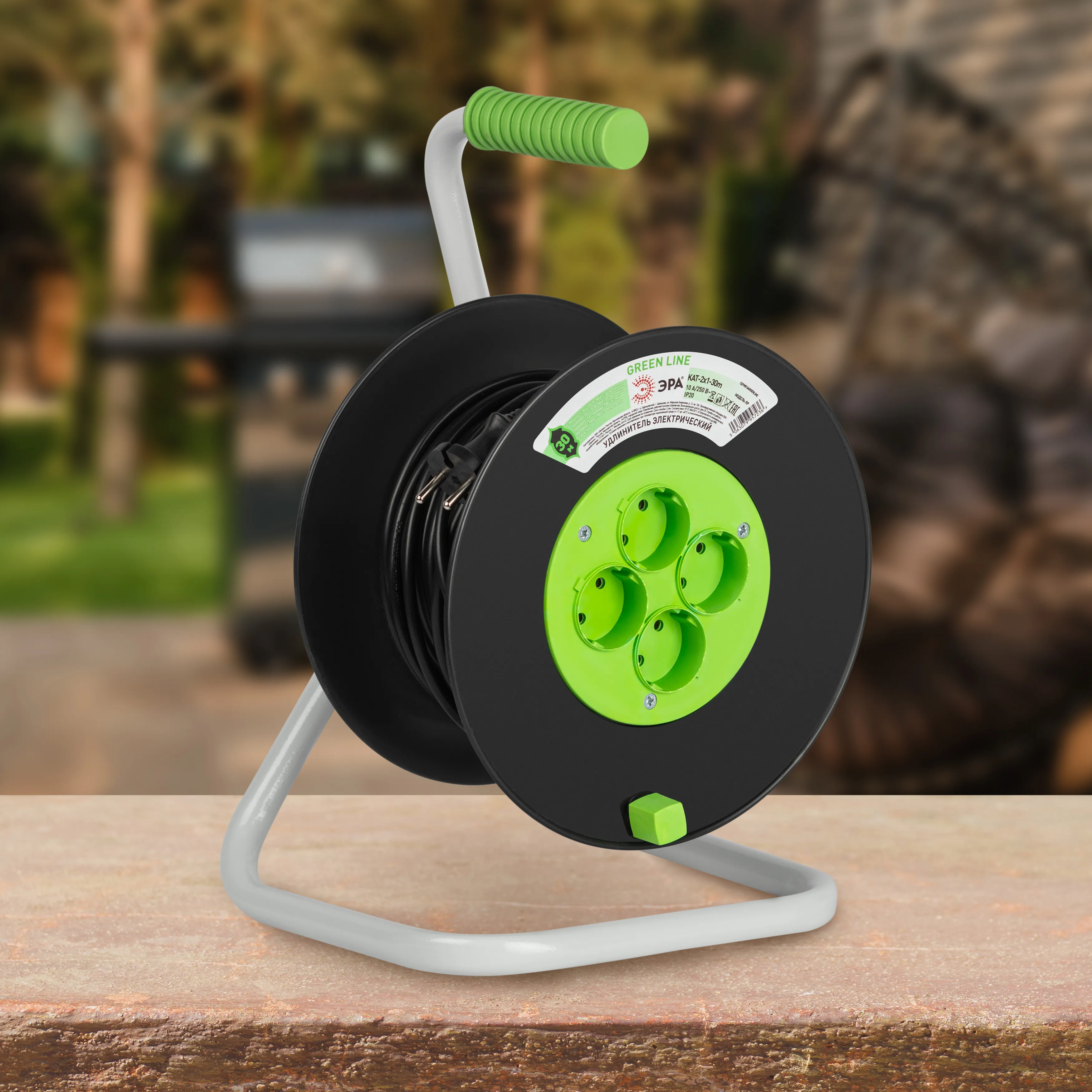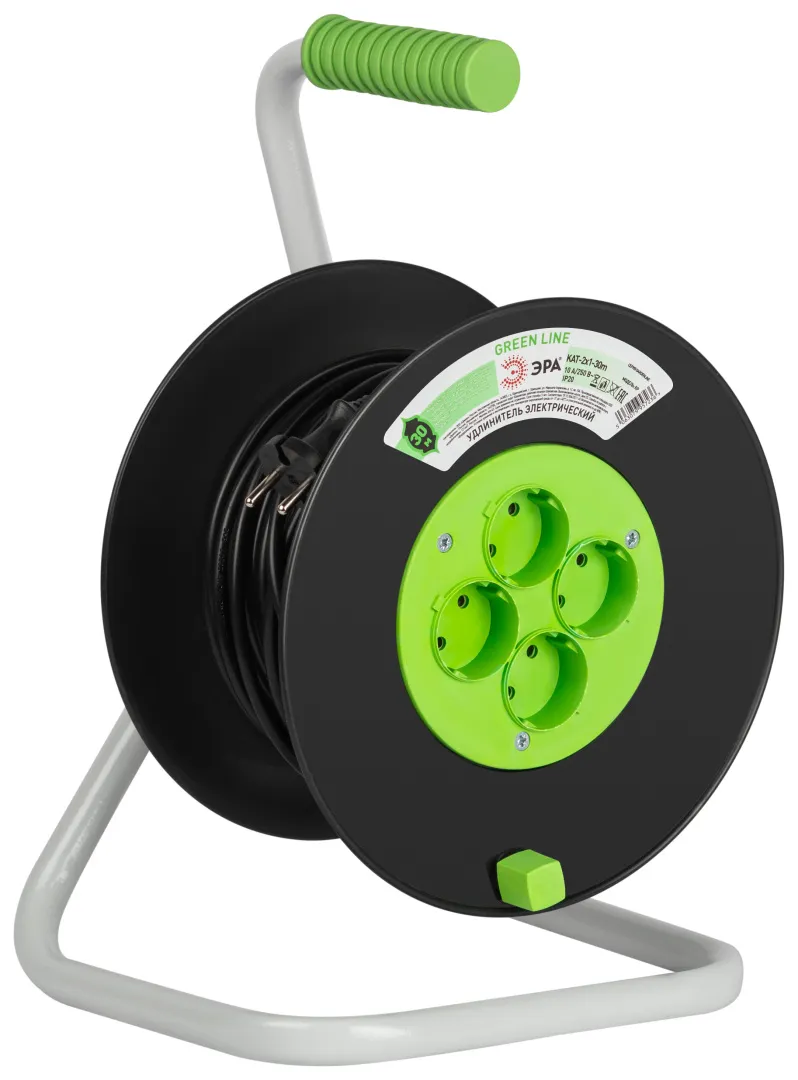 Удлинитель силовой ЭРА GREEN LINE на пластиковой катушке KAT-2x1-30m, 4 розетки без крышек-IP20 без заземления. Провод ПВС 2х1мм2, 30м. Мощность 10А/2200Вт. Используется для работы на строительных площадках или дачных участках. Удобен при работе с приборами, находящимися удаленно от стационарной розетки. Например, газонокосилки, электрические, пилы, триммеры или электродрели. Рама катушки сделана из высокопрочной стали, а пластиковой корпус катушки выполнен с применением негорючих добавок.