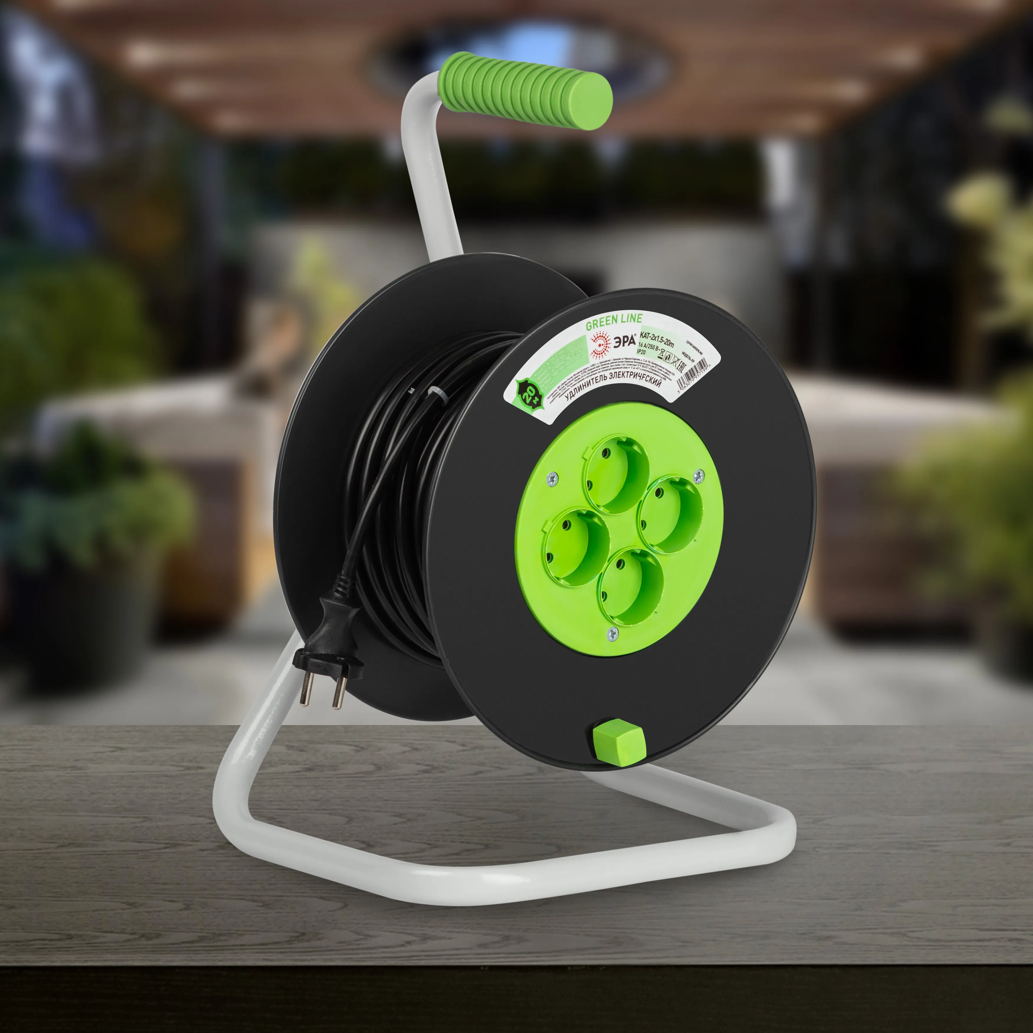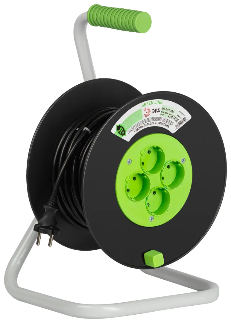 Удлинитель силовой ЭРА GREEN LINE на пластиковой катушке KAT-2x1.5-20m, 4 розетки без крышек-IP20 без заземления. Провод ПВС 2х1,5мм2, 20м. Мощность 16А/3500Вт. Используется для работы на строительных площадках или дачных участках. Удобен при работе с приборами, находящимися удаленно от стационарной розетки. Например, газонокосилки, электрические, пилы, триммеры или электродрели. Рама катушки сделана из высокопрочной стали, а пластиковой корпус катушки выполнен с применением негорючих добавок.