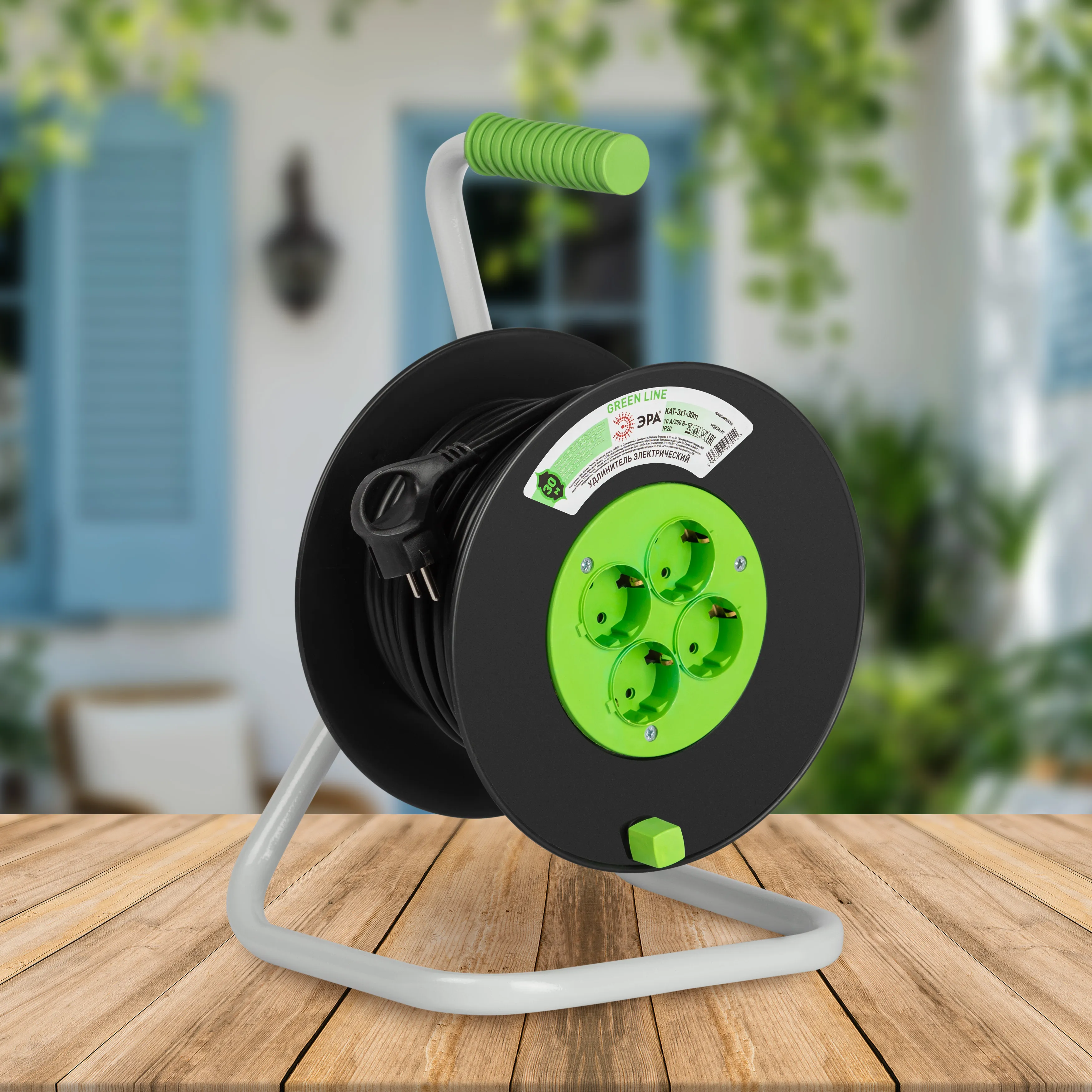 Удлинитель силовой ЭРА GREEN LINE на пластиковой катушке KAT-3x1-30m, 4 розетки без крышек- IP20 с заземлением. Провод ПВС 3х1мм2, 30м. Мощность 10А/2200Вт. Используется для работы на строительных площадках или дачных участках. Удобен при работе с приборами, находящимися удаленно от стационарной розетки. Например, газонокосилки, электрические, пилы, триммеры или электродрели. Рама катушки сделана из высокопрочной стали, а пластиковой корпус катушки выполнен с применением негорючих добавок.