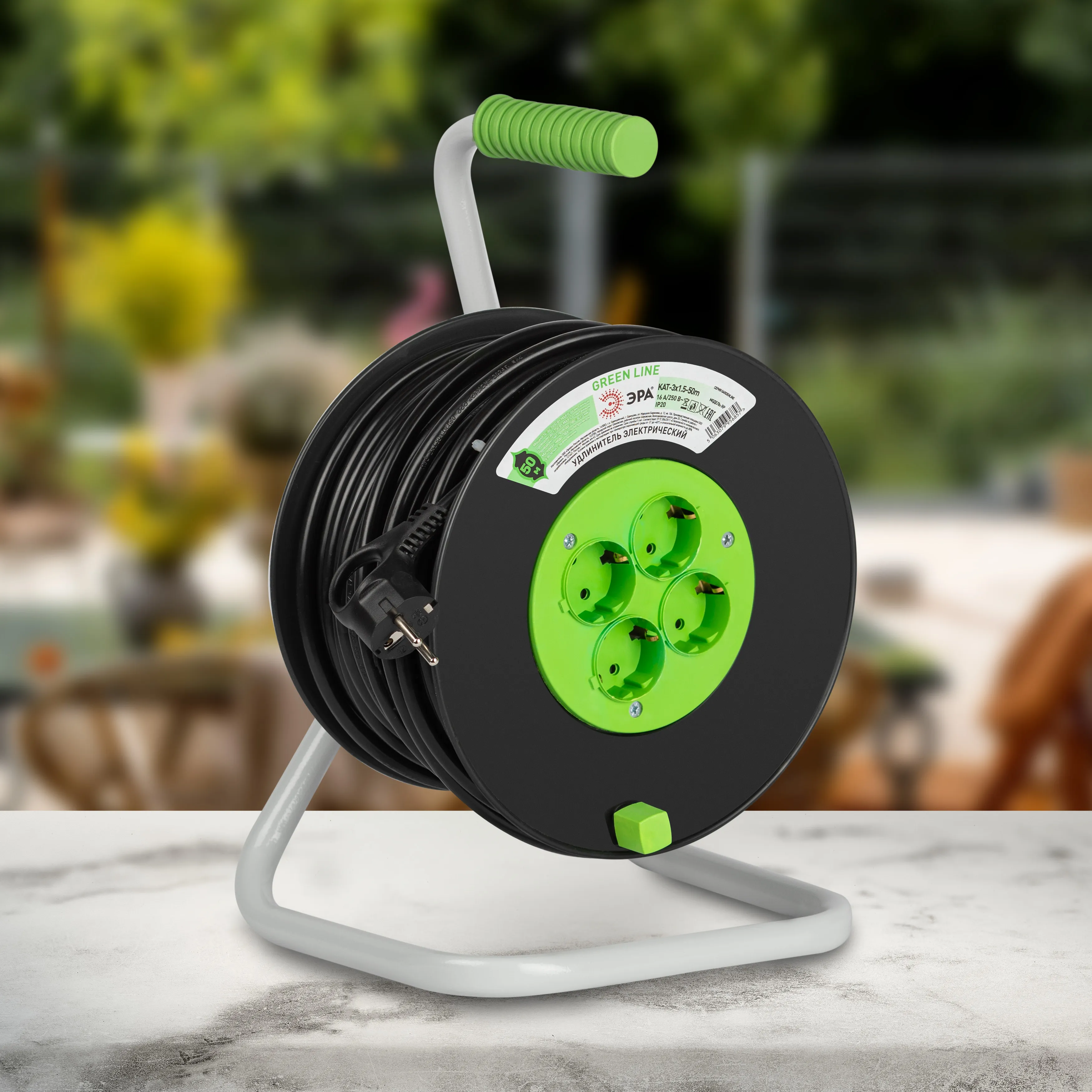 Удлинитель силовой ЭРА GREEN LINE на пластиковой катушке KAT-3x1.5-50m, 4 розетки без крышек-IP20 с заземлением. Провод ПВС 3х1,5мм2, 50м. Мощность 16А/3500Вт. Используется для работы на строительных площадках или дачных участках. Удобен при работе с приборами, находящимися удаленно от стационарной розетки. Например, газонокосилки, электрические, пилы, триммеры или электродрели. Рама катушки сделана из высокопрочной стали, а пластиковой корпус катушки выполнен с применением негорючих добавок.
