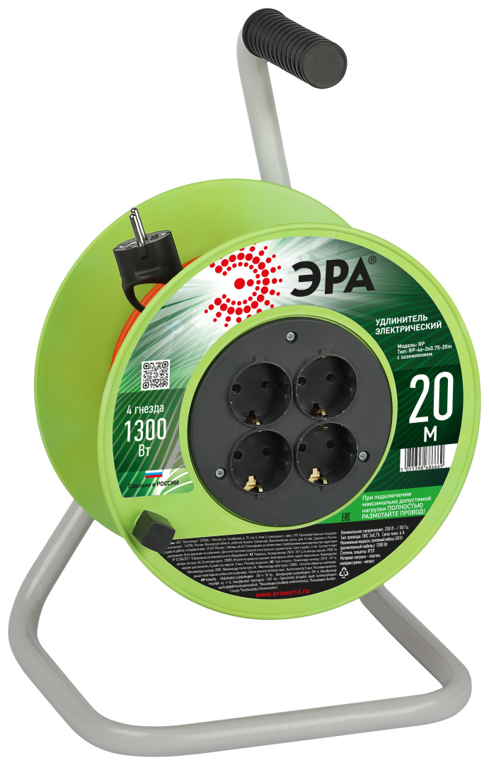 Удлинитель силовой на пластиковой катушке ЭРА RP-4e-3х0.75-20m с заземлением, 4 розетки, провод ПВС 3х0,75м2, 20 м. Мощность 6А/1300Вт. Используется для работы на строительных площадках или дачных участках. Удобен при работе с приборами, находящимися удаленно от стационарной розетки. Например, газонокосилки, электрические, пилы, триммеры или электродрели. Провод в удлинителях Эра сделан из 100% меди, что делает его абсолютно пожаробезопасным. Рама удлинителя сделана из высокопрочной стали, а пластиковой корпус выполнен с применением негорючих добавок.