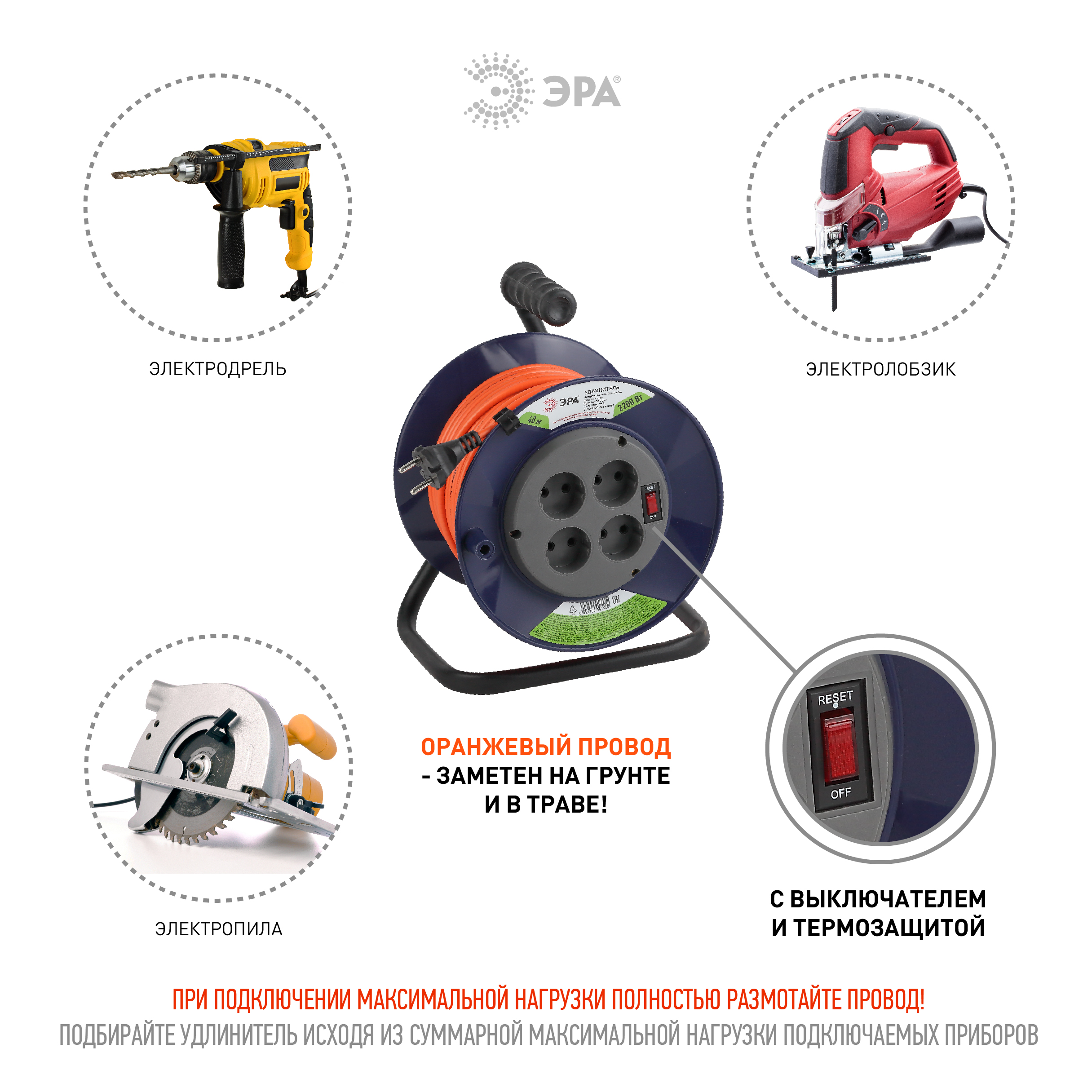 Удлинитель силовой на пластиковой катушке ЭРА RPx-4s-2x1.0-40m с заземлением, с выключателем, ПВС 2х1м2, 4 розетки, 40 м. Мощность 10А/2200Вт. Используется для работы на строительных площадках или дачных участках. Удобен при работе с приборами находящимися удаленно от стационарной розетки. Например, газонокосилки, электрические, пилы, триммеры или электродрели. Провод в удлинителях Эра сделан из 100% меди, что делает его абсолютно пожаробезопасным. Рама удлинителя сделана из высокопрочной стали а пластиковой корпус выполнен с применением негорючих добавок.