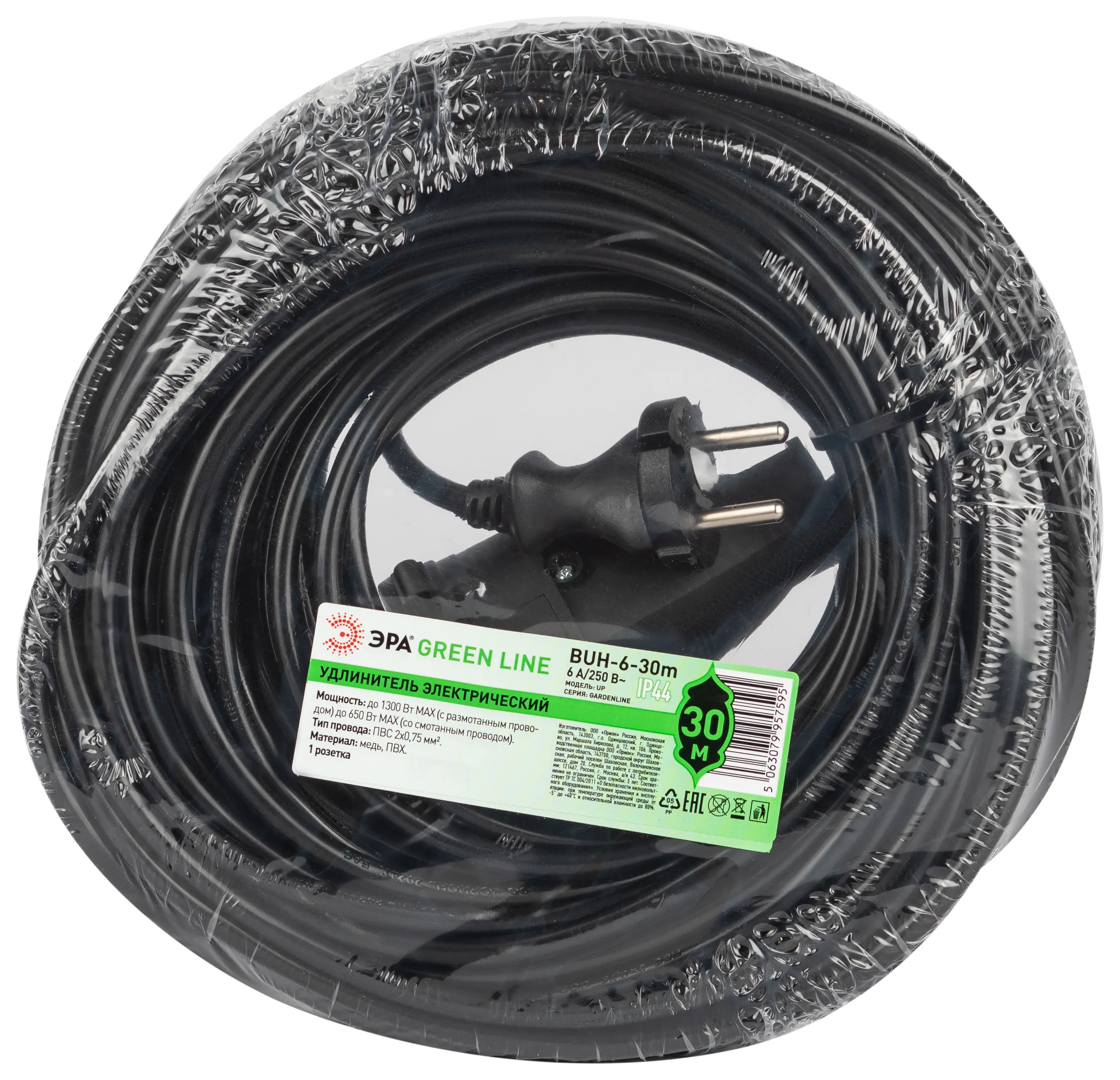 Удлинитель силовой ЭРА GREEN LINE в бухте BUH-6-30m без заземления, 1 розетка с крышкой - IP 44, провод 30м ПВС 2х0,75мм2. Мощность 6А/1300Вт. Используется для работы на строительных площадках или дачных участках. Удобен при работе с приборами находящимися удаленно от стационарной розетки. Например, газонокосилки, электрические пилы, триммеры или электродрели.