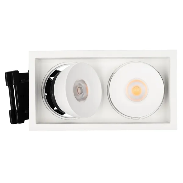 Встраиваемый поворотный светильник для потолка. Мощность 2x9W, цвет ТЕПЛЫЙ 3000K, св.поток 1260лм, угол 45°, RA>90. Корпус прямоугольный белый. Питание AC180-240V. Размеры LxWxH 148x80x90мм. Установка в отверстие 140x70мм. Драйвер в комплекте 2 шт (30-45V, 220mA).