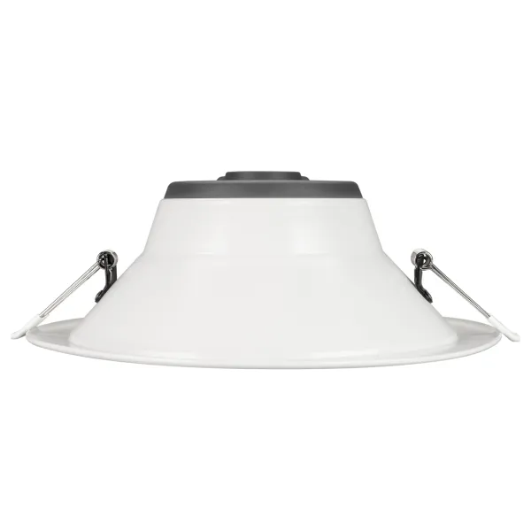 Светильник даунлайт с изменяемой цветовой температурой и переключателем на корпусе. Мощность 28 Вт, св. поток 3000 лм, 108 лм/Вт, белый 6000К, или дневной 4000К, или теплый 3000К (выбор цвета свечения при установке, фиксированный), CRI>80, угол 80°, напряжение питания 230 В. Белый круглый корпус из алюминия, степень защиты IP20. Размер: диаметр 232 мм, высота 83 мм. Монтаж встраиваемый, установочное отверстие: диаметр 195-210 мм. Драйвер 25-43 В, 700 мА, пульсация <0,7%.