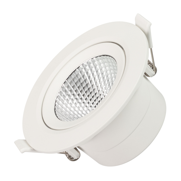 Встраиваемый поворотный светильник "даунлайт". Мощность 10 Вт, св. поток 900 лм, 90 лм/Вт, теплый 3000 K, CRI>80, UGR<19, угол 36°, напряжение питания 230 В. Белый круглый корпус из теплопроводящего полиамида, степень защиты IP20, угол поворота оси 30°. Размер: диаметр 105 мм, высота 51.5 мм. Монтаж встраиваемый, установочное отверстие диаметр 83-95 мм. Пульсация <2%.
