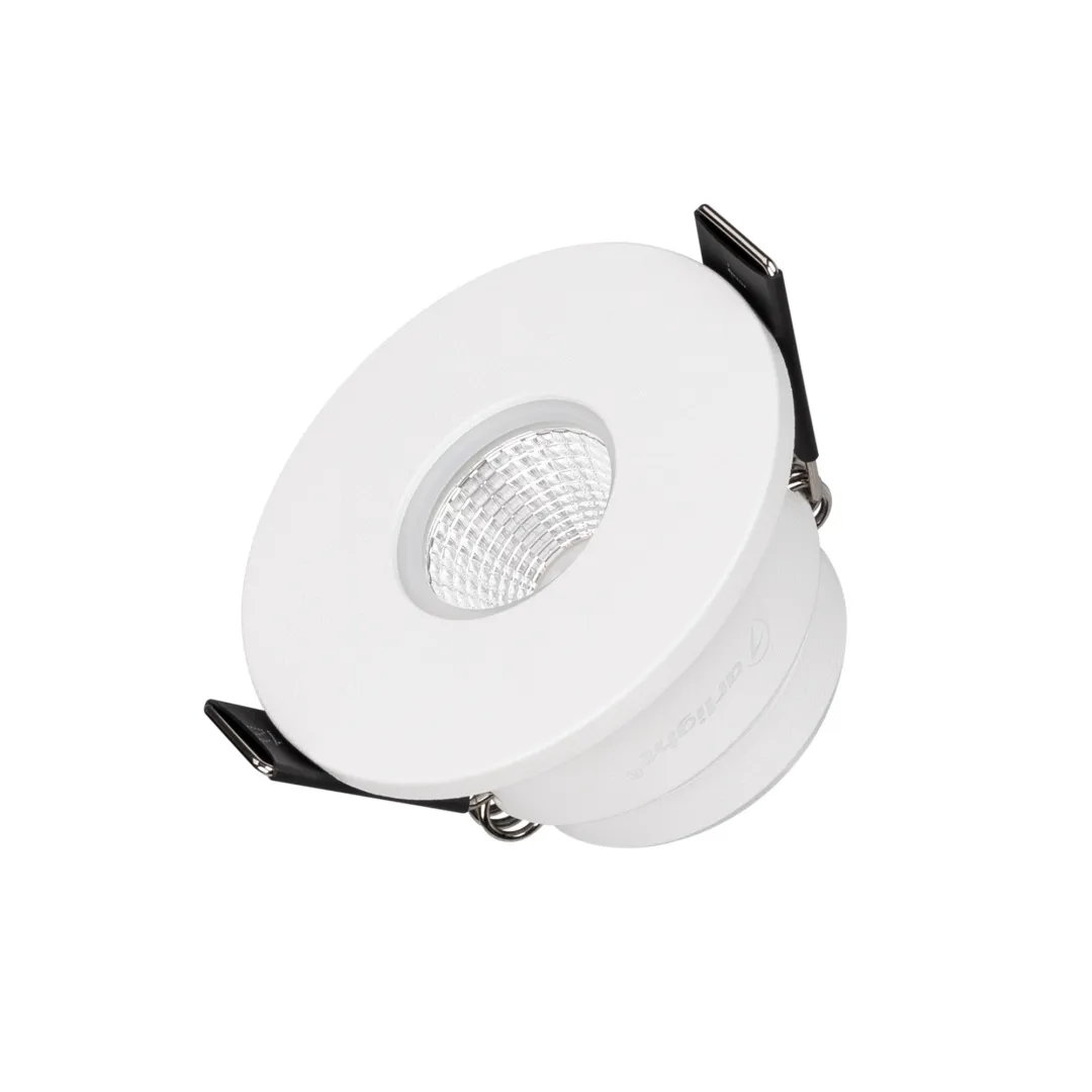 Встраиваемый светильник даунлайт. Мощность 5 Вт, св. поток 400 лм, 80 лм/Вт, теплый 3000 K, CRI>90, угол 60°, напряжение питания 230 В. Белый круглый корпус из алюминия, экран PMMA, степень защиты IP54. Размер: диаметр 54 мм, высота 30 мм. Монтаж встраиваемый, установочное отверстие: диаметр 45 мм. Драйвер 8-12 В, 400 мА, пульсация <2%.