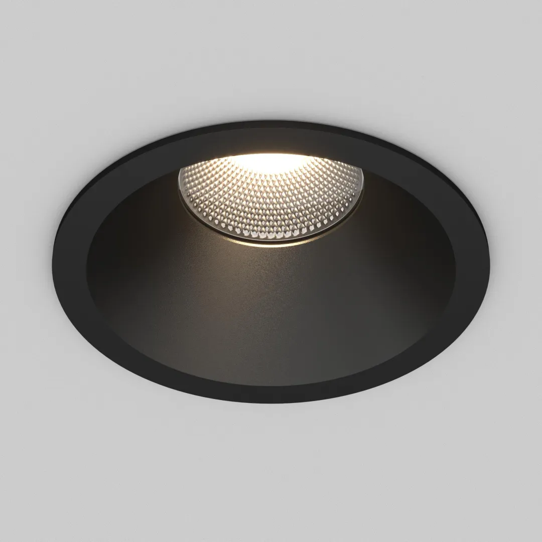 Встраиваемый светильник даунлайт. Мощность 10 Вт, св. поток 980 лм, 98 лм/Вт, тёплый 3000 K, CRI>90, угол 50°, напряжение питания 230 В. Чёрный круглый корпус из алюминия, степень защиты IP20. Размер: диаметр 82 мм, высота 53 мм. Монтаж встраиваемый, установочное отверстие: диаметр 75 мм. UGR<14. Драйвер 30-42 В, 250 мА, пульсация <2%.