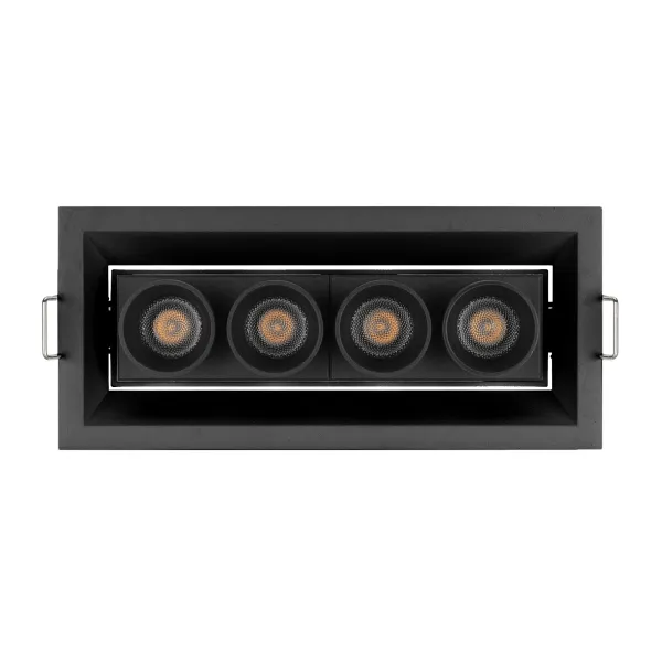 Встраиваемый поворотный светильник. Мощность 10 Вт, св. поток 750 лм, 75 лм/Вт, дневной 4000 K, CRI>98, угол 30°, напряжение питания 230 В. Чёрный прямоугольный корпус из алюминия, экран PMMA, степень защиты IP20. Размер: длина 150 мм, ширина 67 мм, высота 50 мм. Монтаж встраиваемый, установочное отверстие длина 145 мм, ширина 60 мм. Драйвер 9-14 В, 700 мА, пульсация <1%.