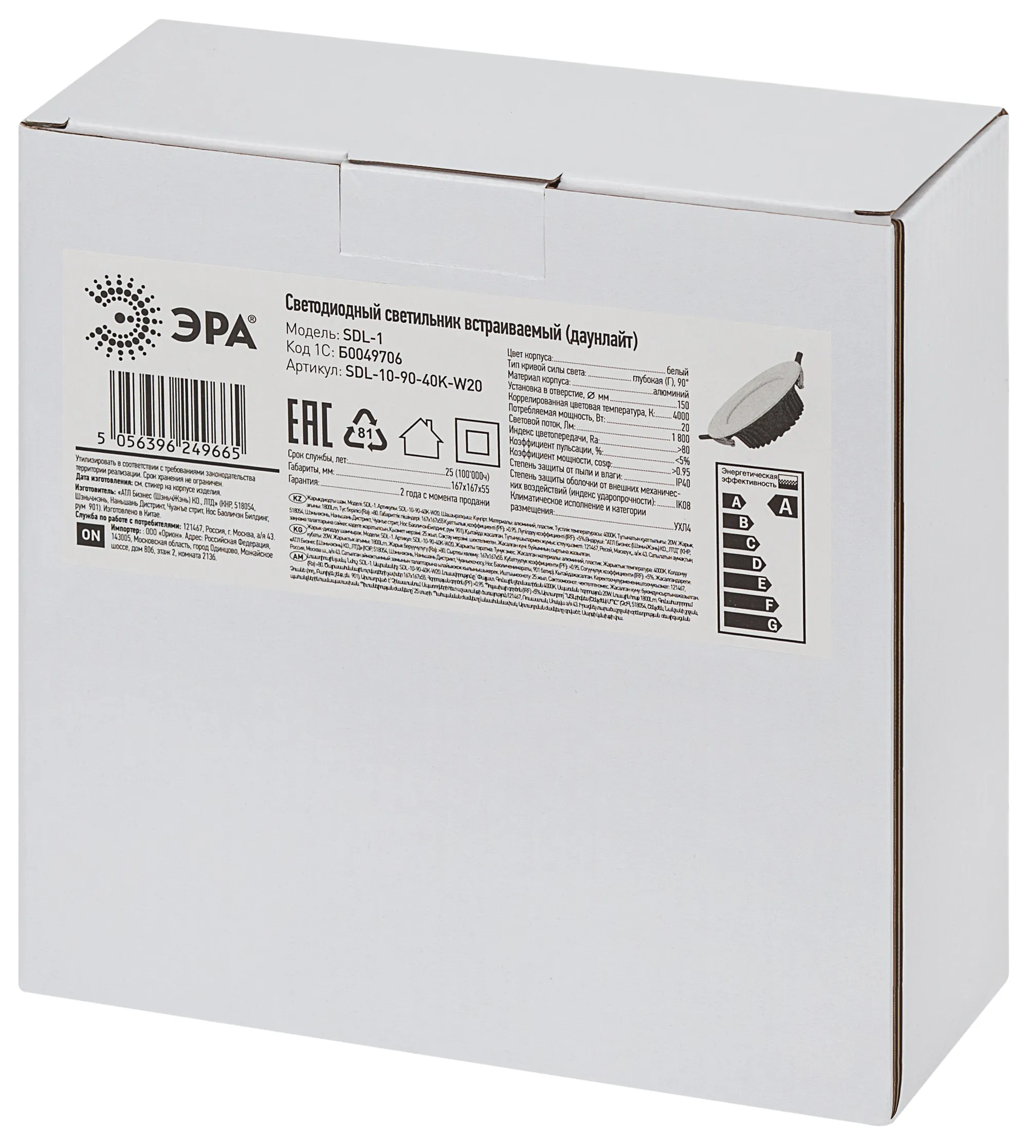 ЭРА SDL - встраиваемый светодиодный светильник формата даунлайт. Оптимальное решение в качестве замены люминесцентных даунлайтов для торговых, офисных и общественных пространств. Коэффициент передачи >80 в совокупности с коэффициентом пульсации <5% создают максимально комфортное освещение. Световая отдача >90 Лм/Вт обеспечивает высокую энергоэффективность и экономичность светильников. Встраиваемые LED-светильники с глубокой кривой силы света (КСС «Г»). Доступны к заказу в 2 вариантах цветовой температуры: нейтральный белый свет 4000 К и тёплый белый свет 3000 К. Варианты мощности: 20Вт, 25Вт, 30Вт и 35Вт. Надёжный алюминиевый корпус.