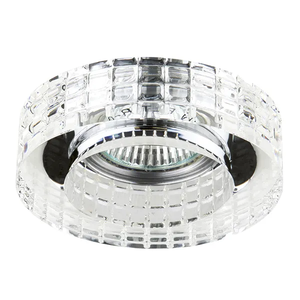Врезное отверстие: d55 h50; Внешние габариты: D100 H30; Материал - основание/плафон: металл / Crystalline; Цвет-основание/плафон: хром/прозрачный; Лампа: 12В/220В MR16 Gu5.3 max 50Вт;
