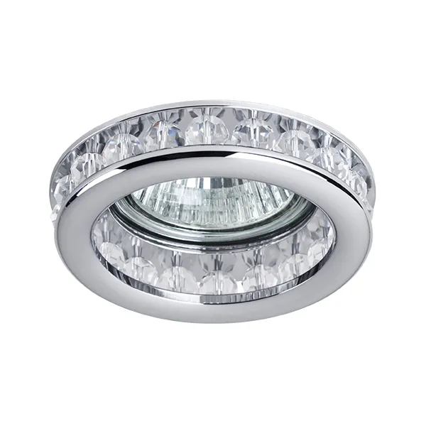 Врезное отверстие: d60 h60; Внешние габариты: D75 H20 (хром); Материал - основание/плафон: металл / Crystalline; Цвет-основание/плафон: хром/прозрачный; Лампа: 12В/220В MR16/HP16 Gu5,3/GU10 max 50Вт;