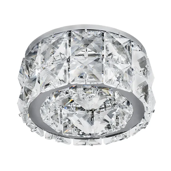 Врезное отверстие: d45 h30; Внешние габариты: D98 H50; Материал - основание/плафон: металл / Crystalline; Цвет-основание/плафон: хром/прозрачный; Лампа: 12В/220В G9 max 40Вт;