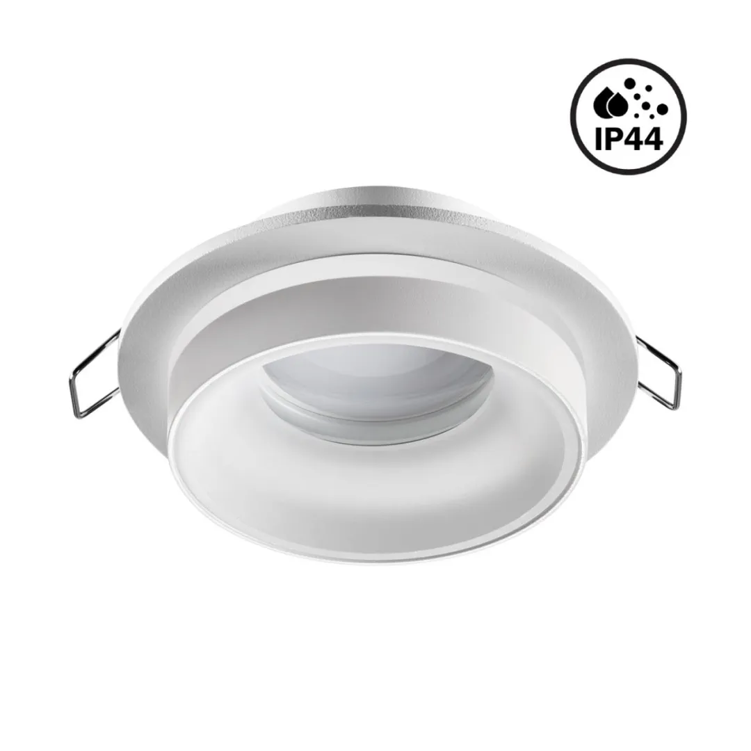 Встраиваемый неповоротный светильник с повышенной степенью пылевлагозащиты (IP44) подходит для установки во влажные помещения. Лампа в комплект не входит.