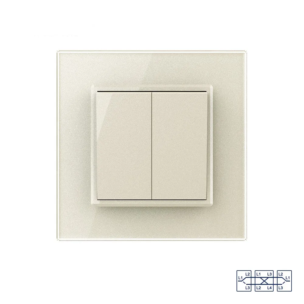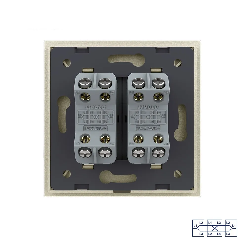 Двухклавишный перекрестный механический выключатель Livolo на 1 пост со стеклянной рамкой LIVOLO предназначен для управления двумя линиями нагрузки из трех мест. Для управления из трех мест необходимы два проходных выключателя и один перекрестный. В схеме подключения перекрестный выклчючатель устанавливается между проходными. Поддерживает управление лампами любого типа.