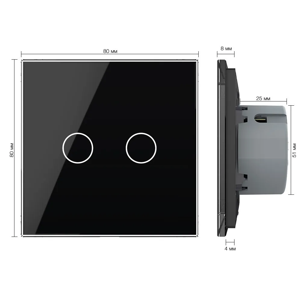 Двухклавишный сенсорный выключатель со стеклянной лицевой панелью LIVOLO предназначен для управления двумя линиями нагрузки. Поддерживает управление лампами любого типа.