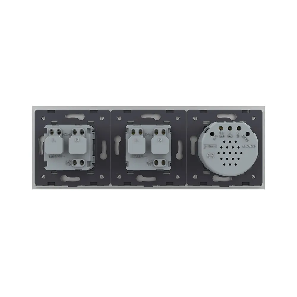 Двухклавишный сенсорный выключатель с двумя розетками Livolo на 3 поста со стеклянной комбинированной панелью LIVOLO предназначен для управления двумя линиями нагрузки. Поддерживает управление лампами любого типа. Используется для подключения к электрической сети переменного тока 110-250 В, 50-60 Гц различных приборов и агрегатов бытового и аналогичного назначения.