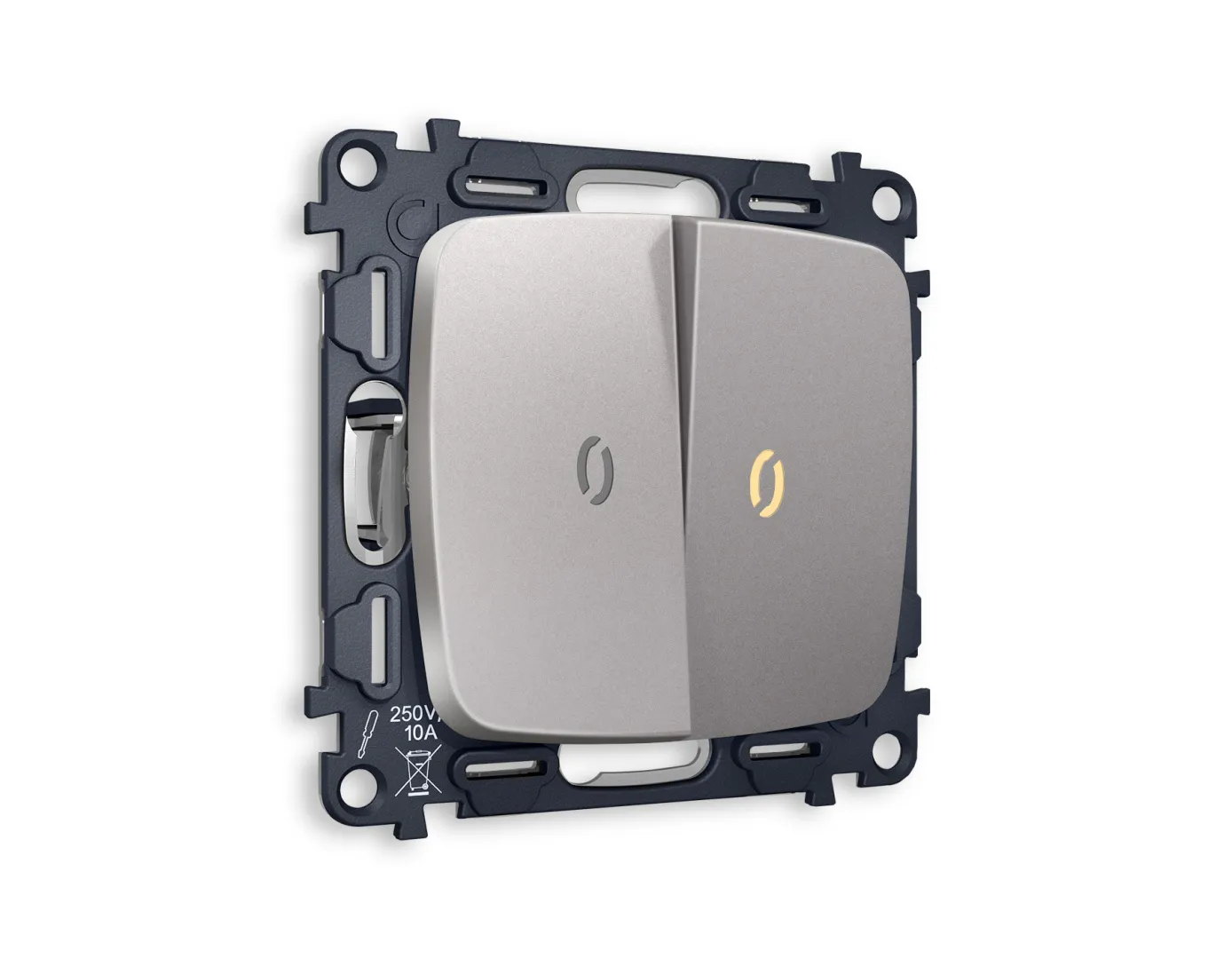 Комплект механизма 2-кл проходного выключателя с подсветкой 3200K OMEGA Сталь матовый QUANT (OP5040, VM120, G22Y) MO504030