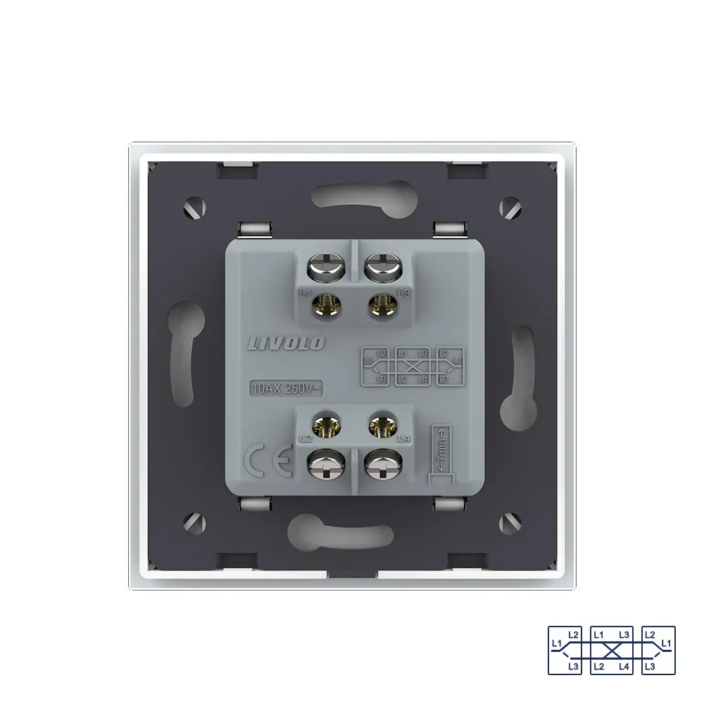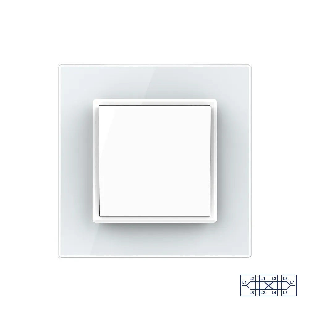 Одноклавишный перекрестный механический выключатель Livolo на 1 пост со стеклянной рамкой LIVOLO предназначен для управления одной линией нагрузки из трех мест. Для управления из трех мест необходимы два проходных выключателя и один перекрестный. В схеме подключения перекрестный выклчючатель устанавливается между проходными. Поддерживает управление лампами любого типа.