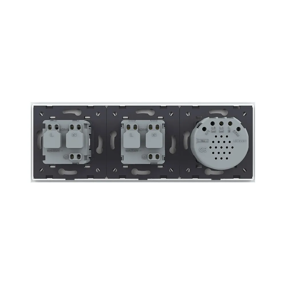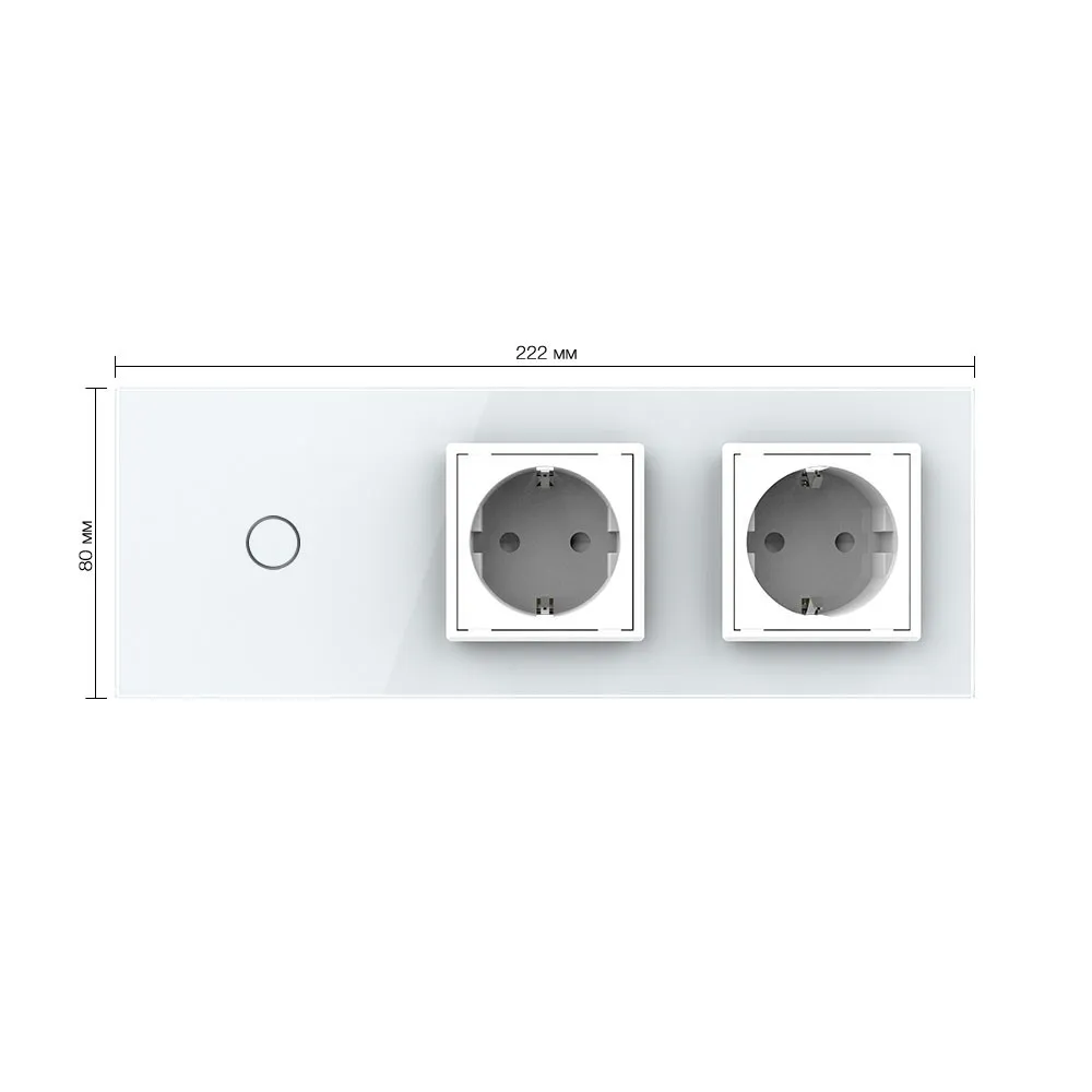 Одноклавишный сенсорный выключатель с двумя розетками Livolo на 3 поста со стеклянной комбинированной панелью LIVOLO предназначен для управления одной линией нагрузки. Поддерживает управление лампами любого типа. Используется для подключения к электрической сети переменного тока 110-250 В, 50-60 Гц различных приборов и агрегатов бытового и аналогичного назначения.