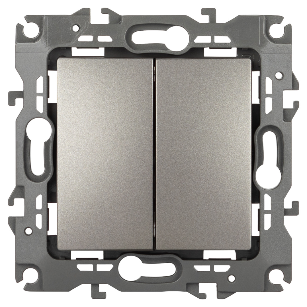 Выключатель перекрёстный/промежуточный двойной серии Эра 12 скрытой установки механизм, цвет титан 12-1112-16. Номинальные хар-ки 10А 250В. Сделан из поликарбоната, оснащён автоматическими клеммами для быстрой и надёжной фиксации жил кабеля в механизме. Парные клеммы обеспечивают соединение шлейфом. Монтаж в подрозетник производится на винты. Рамки приобретаются отдельно.
