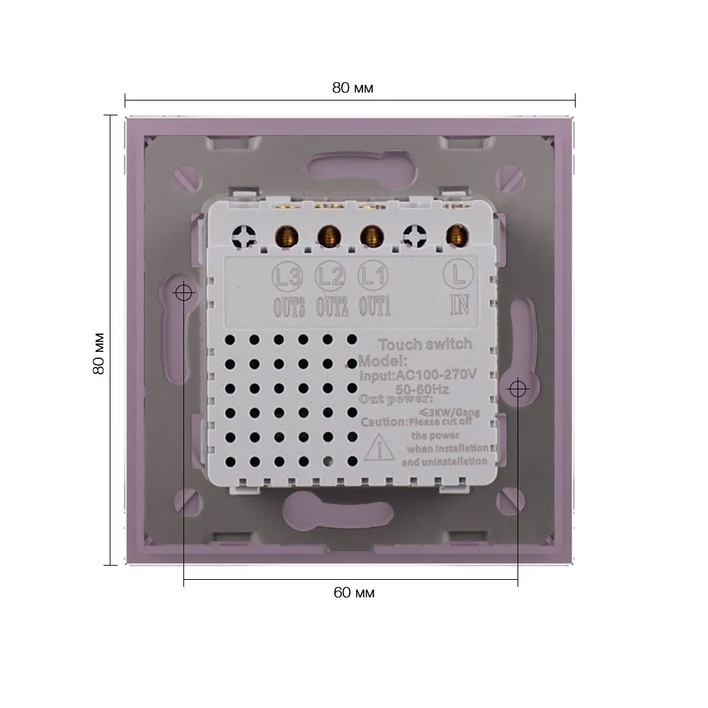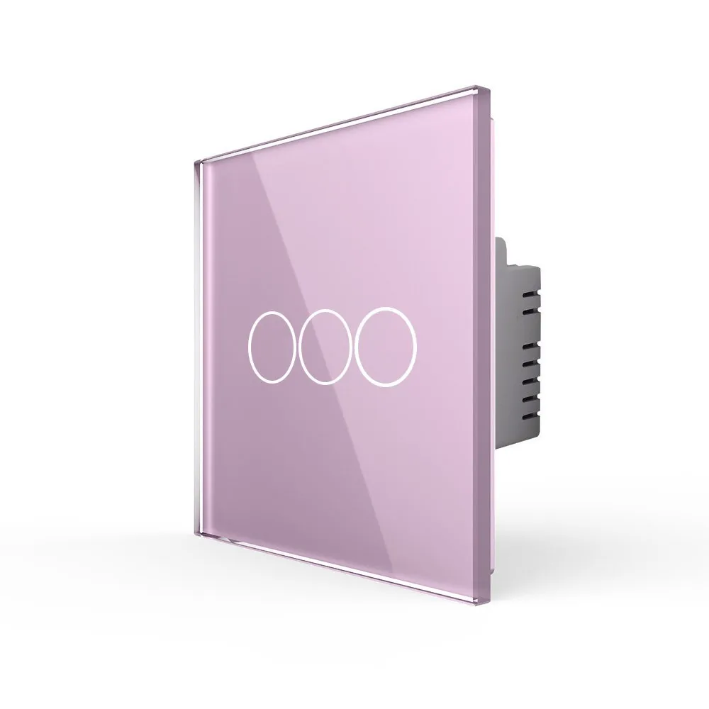 Трехклавишный сенсорный выключатель со стеклянной лицевой панелью LIVOLO LT-C703-17 розового цвета предназначен для управления тремя линиями нагрузки. Поддерживает управление лампами любого типа. Включение/выключение освещения осуществляется одним легким прикосновением. Мягкая светодиодная подсветка позволит с легкостью найти выключатель в темном помещении. Для установки выключателя не требуется переделывать проводку. Просто замените старый выключатель на сенсорный. Устанавливается в круглый подрозетник в комплекте со стеклянной лицевой панелью (в комплекте). Эксплуатация Коснитесь сенсора для вкл/выкл света. Выключатель имеет двухцветную светодиодную подсветку клавиши. Красный цвет - выключатель включен, синий цвет - выключен. Рабочее напряжение: 110-240 В, 50-60 Гц. Мощность нагрузки: 5 Вт/Клавиша - 1000 Вт/Клавиша. Выключатель может немного нагреваться, когда включен. Избегайте использования нагрузок, превышающих номинальный выходной ток 5 А/Клавиша. Подходит для эксплуатации с любыми типами ламп. Если выключатель не работает должным образом, отключите питание на 1 минуту, а затем снова включите. Срок службы: 30 000 переключений. Гарантия 24 мес. Комплектация Механизм выключателя. Металлический суппорт для крепления. Стеклянная панель. Меры предосторожности Чтобы не получить травму и не повредить выключатель, внимательно прочтите все инструкции. Не устанавливайте изделие в местах с высокой температурой, сильным светом и сильными магнитными полями, а также в других суровых условиях, например, вблизи источников огня. Неправильное использование изделия может легко привести к его повреждению или поставить под угрозу личную безопасность и безопасность имущества. Потребитель несет ответственность за любой личный и имущественный ущерб, возникший в результате неправильного использования продукта в соответствии с руководством пользователя. Категорически запрещается разбирать выключатель. Избегайте использования нагрузок, превышающих номинальный выходной ток выключателя. Следует избегать интенсивных физических действий, включая стуки, бросания, топтание, сдавливание и т. д.