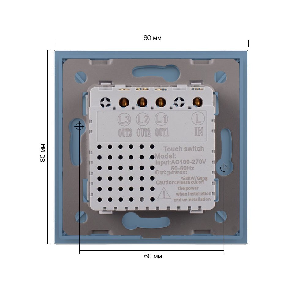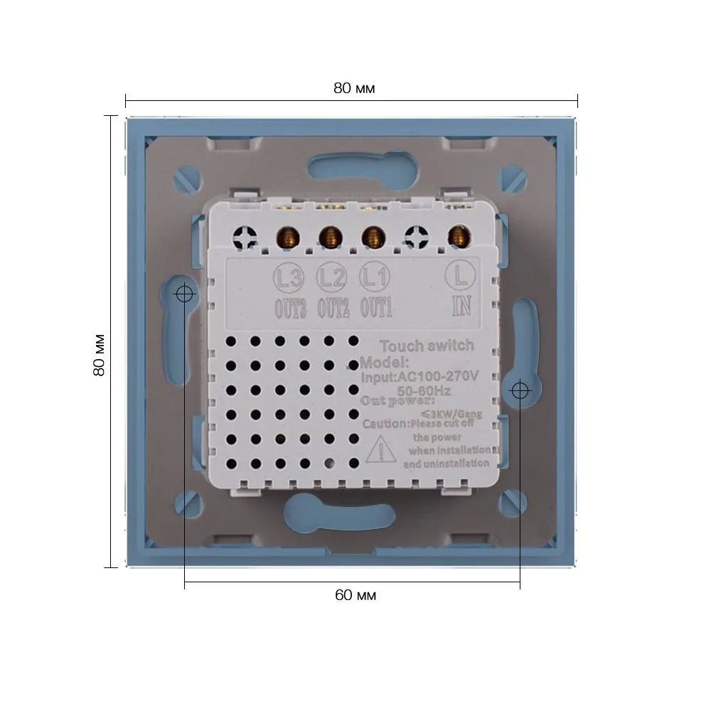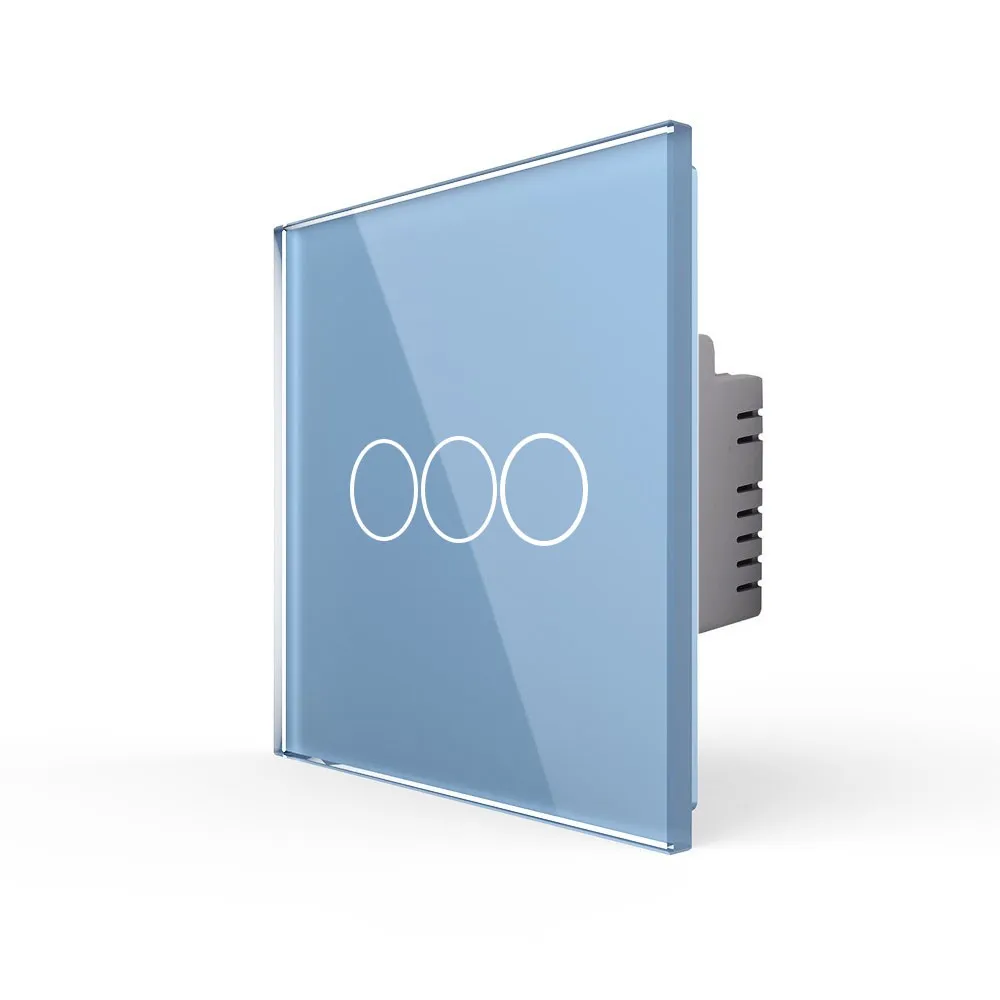 Трехклавишный сенсорный выключатель со стеклянной лицевой панелью LIVOLO LT-C703-19 синего цвета предназначен для управления тремя линиями нагрузки. Поддерживает управление лампами любого типа. Включение/выключение освещения осуществляется одним легким прикосновением. Мягкая светодиодная подсветка позволит с легкостью найти выключатель в темном помещении. Для установки выключателя не требуется переделывать проводку. Просто замените старый выключатель на сенсорный. Устанавливается в круглый подрозетник в комплекте со стеклянной лицевой панелью (в комплекте). Эксплуатация Коснитесь сенсора для вкл/выкл света. Выключатель имеет двухцветную светодиодную подсветку клавиши. Красный цвет - выключатель включен, синий цвет - выключен. Рабочее напряжение: 110-240 В, 50-60 Гц. Мощность нагрузки: 5 Вт/Клавиша - 1000 Вт/Клавиша. Выключатель может немного нагреваться, когда включен. Избегайте использования нагрузок, превышающих номинальный выходной ток 5 А/Клавиша. Подходит для эксплуатации с любыми типами ламп. Если выключатель не работает должным образом, отключите питание на 1 минуту, а затем снова включите. Срок службы: 30 000 переключений. Гарантия 24 мес. Комплектация Механизм выключателя. Металлический суппорт для крепления. Стеклянная панель. Меры предосторожности Чтобы не получить травму и не повредить выключатель, внимательно прочтите все инструкции. Не устанавливайте изделие в местах с высокой температурой, сильным светом и сильными магнитными полями, а также в других суровых условиях, например, вблизи источников огня. Неправильное использование изделия может легко привести к его повреждению или поставить под угрозу личную безопасность и безопасность имущества. Потребитель несет ответственность за любой личный и имущественный ущерб, возникший в результате неправильного использования продукта в соответствии с руководством пользователя. Категорически запрещается разбирать выключатель. Избегайте использования нагрузок, превышающих номинальный выходной ток выключателя. Следует избегать интенсивных физических действий, включая стуки, бросания, топтание, сдавливание и т. д.
