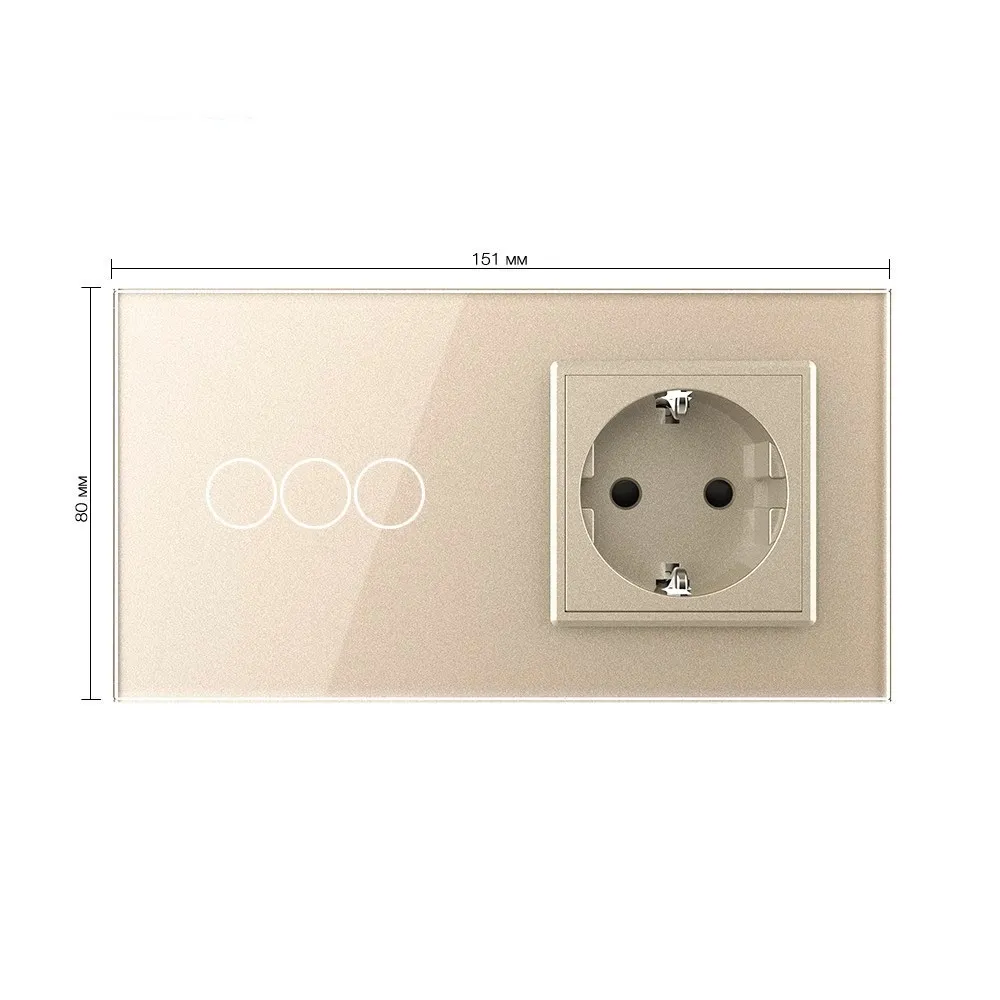 Трехклавишный сенсорный выключатель с розеткой Livolo, 2 поста, цвет шампань