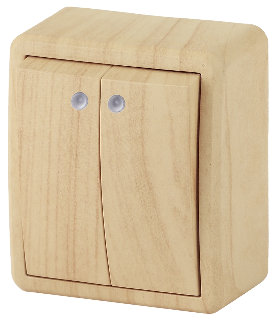 Выключатель 2-клавишный с подсветкой серии Эра Эксперт открытой установки цвет сосна 11-1205-11. Номинальные характеристики 10А 250В. Выключатель выполнен из качественного поликарбоната, оснащён уникальными винтовыми клеммами ЭКСПЕРТ для максимально качественного зажима кабеля в механизме.