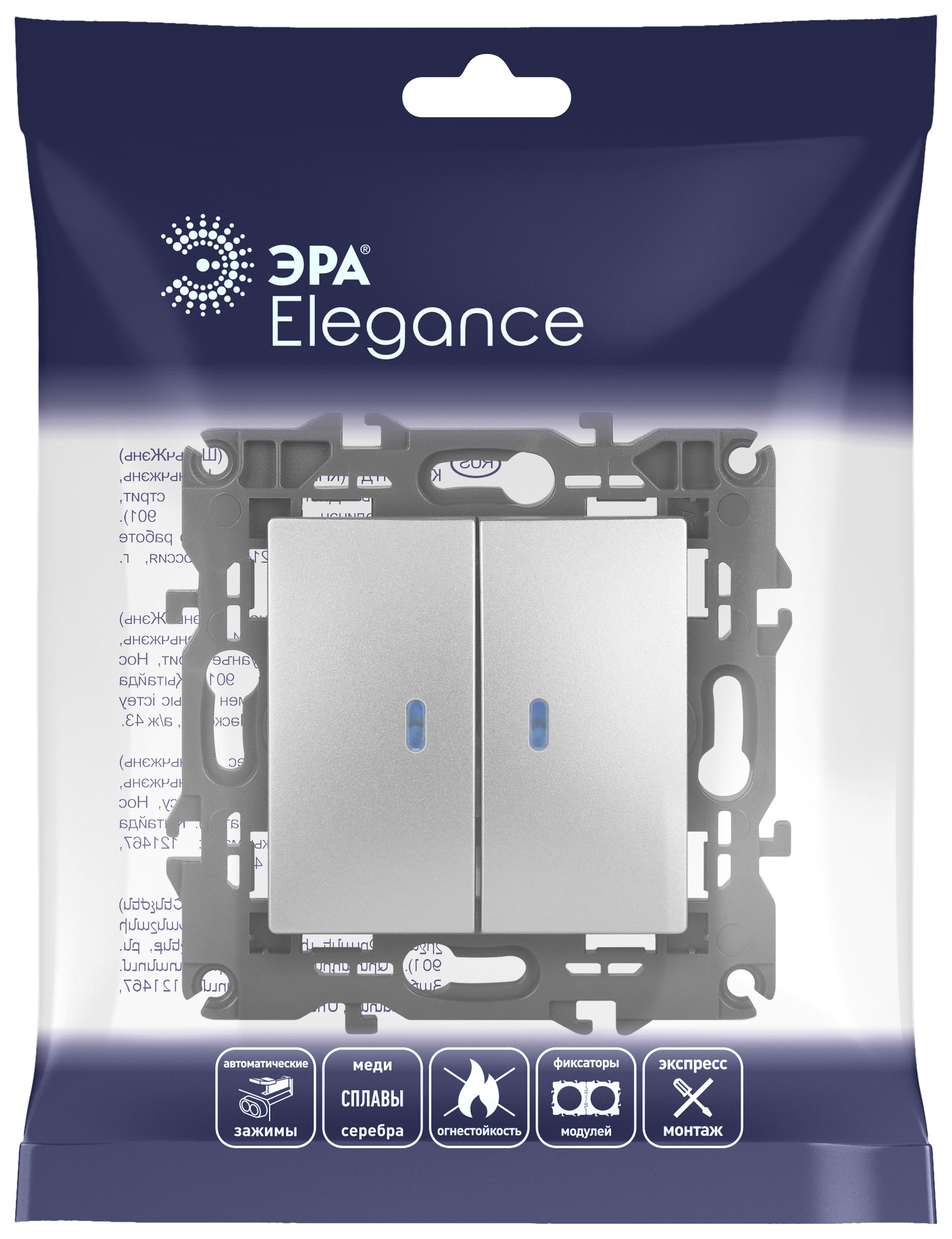 Выключатель 2-клавишный подсветка Эра Elegance алюминий 14-1105-03. Оснащён автоматическими клеммами для надёжной фиксации жил кабеля в механизме. Рамки приобретаются отдельно.