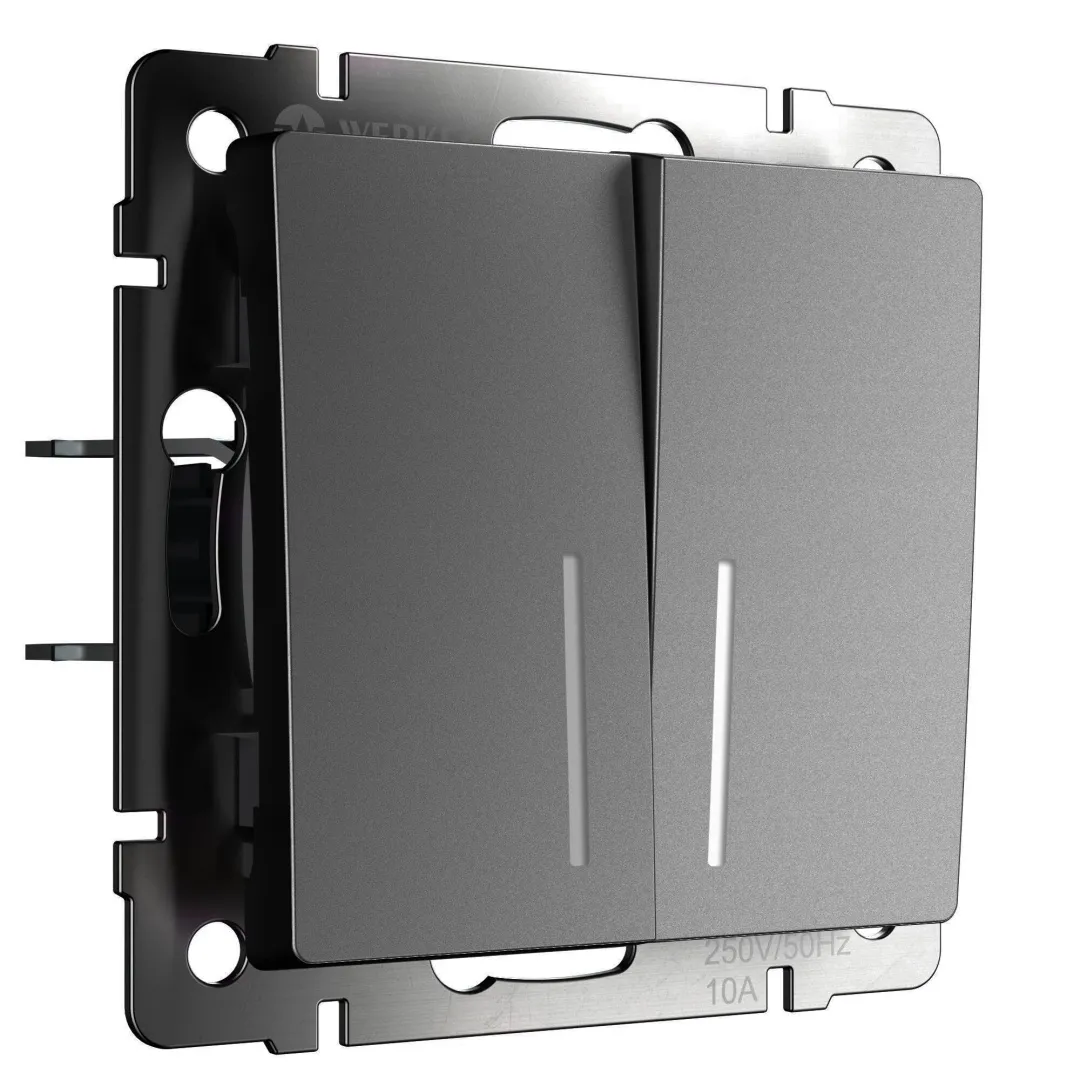 Выключатель двухклавишный проходной с подсветкой в цвете графит матовый W1122164 является ключевым элементом любой домашней электросети, служащим для управления света. Такое электроустановочное изделие предназначено для управления одним источником света из нескольких мест. Выключатель представляет собой механизм нажимного типа, имеющий металлический суппорт и декоративные накладки.