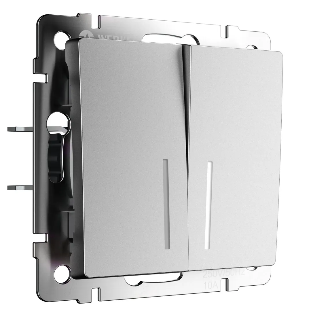 Встраиваемый двухклавишный выключатель в цвете cеребряный матовый с LED подсветкой10 А 250 В, 50 Гц W1122165 является важнейшим элементом любой домашней электросети, служащим для управления света. Приглушенное свечение светодиодов позволяет легко найти выключатель в темное время суток и помогает ориентироваться в квартире, доме или помещении. Выключатель представляет собой механизм нажимного типа, имеющий металлический суппорт и декоративные накладки.