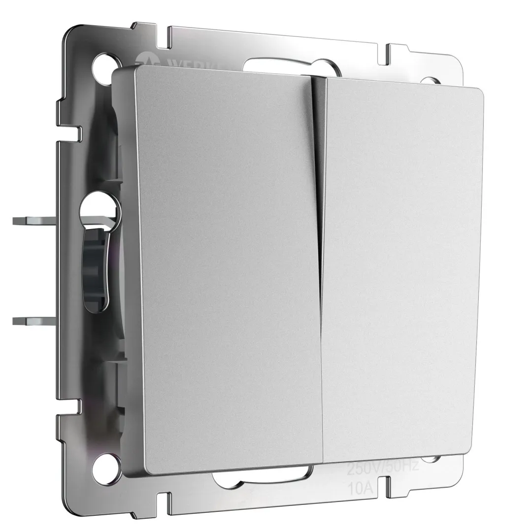 Механизм двухклавишного выключателя оснащен матовой лицевой панелью. Матовая поверхность – это современный тренд, задающий стиль вашему интерьеру. Она не бликует, обладает бархатистой фактурой и тактильной мягкостью. Серебряный цвет будет эффектно смотреться в любом интерьерном пространстве и гармонично сочетаться с любыми материалами.